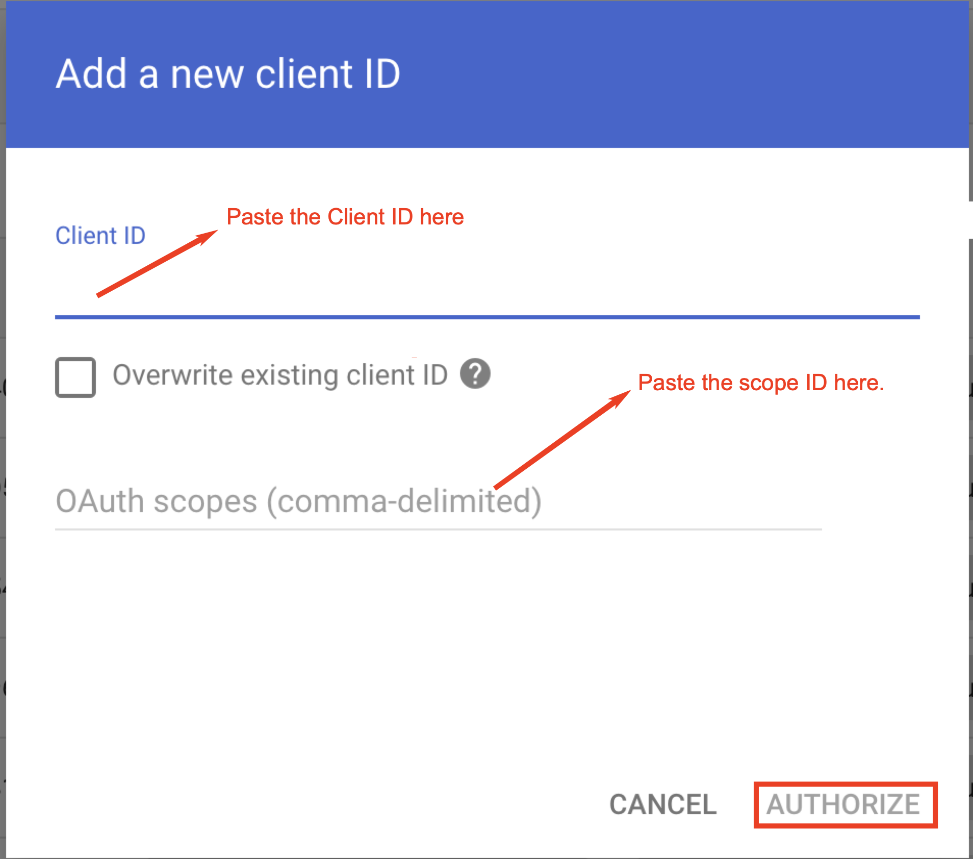 The access permission page is displayed as follows. Copy the **client ID** and **Scopes** **ID** generated.