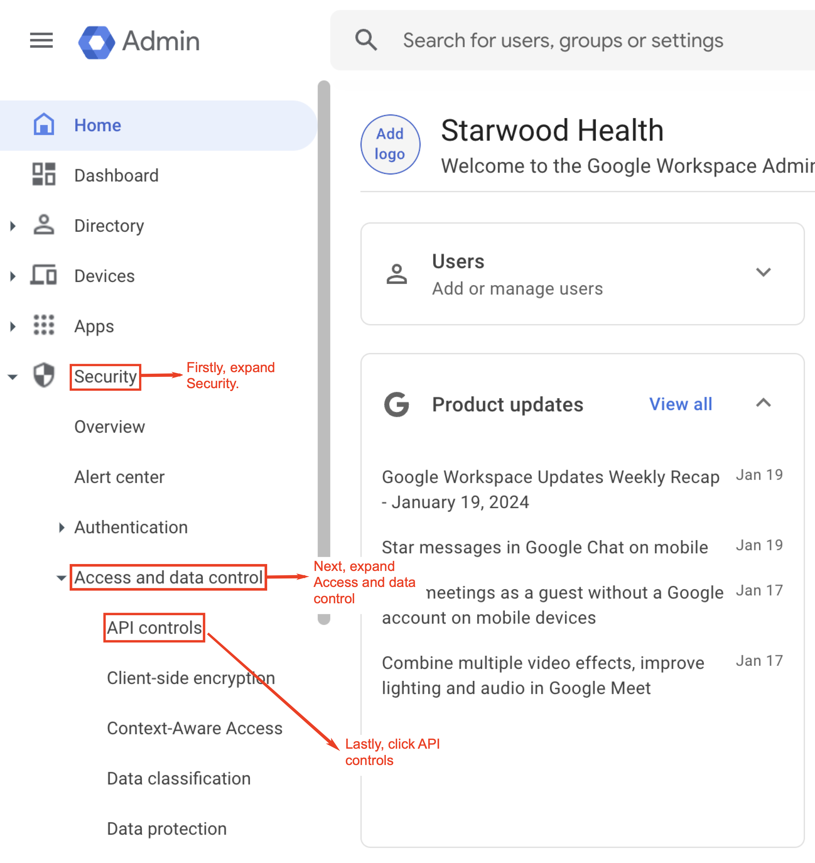 7. In the Admin console left pane, expand **Security** and then expand **Access and data control**.