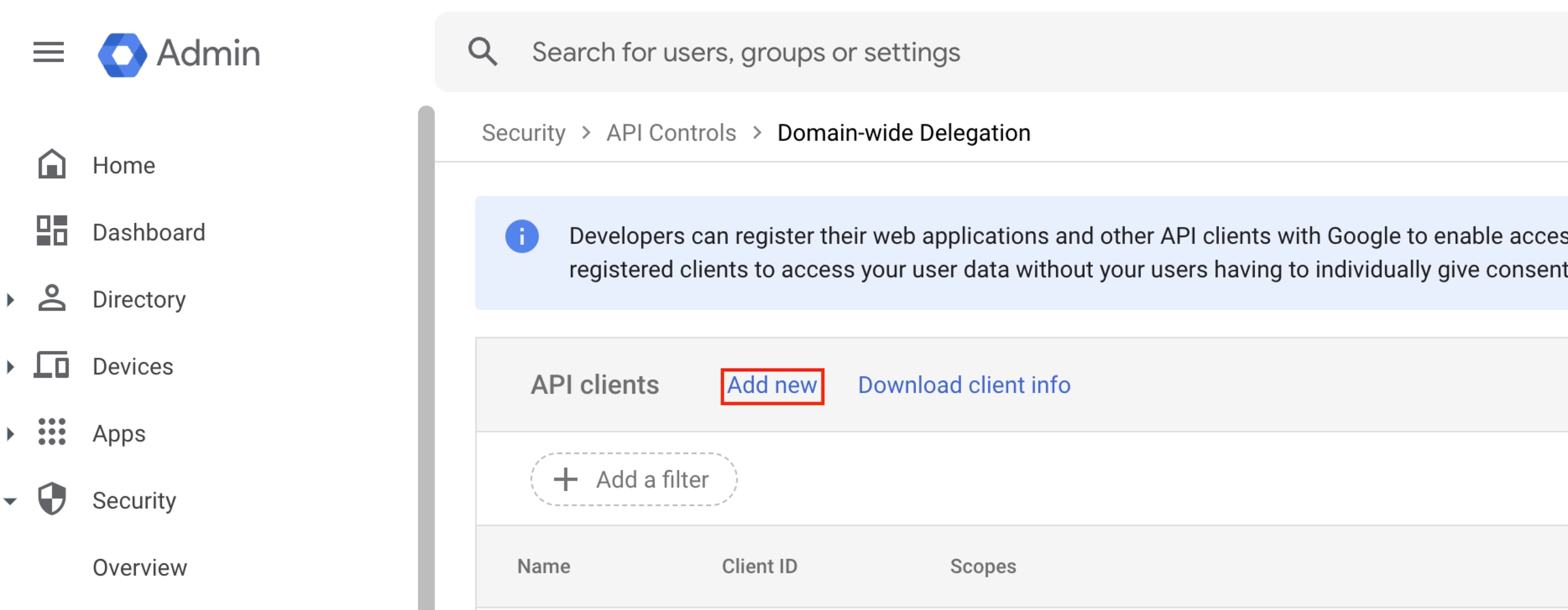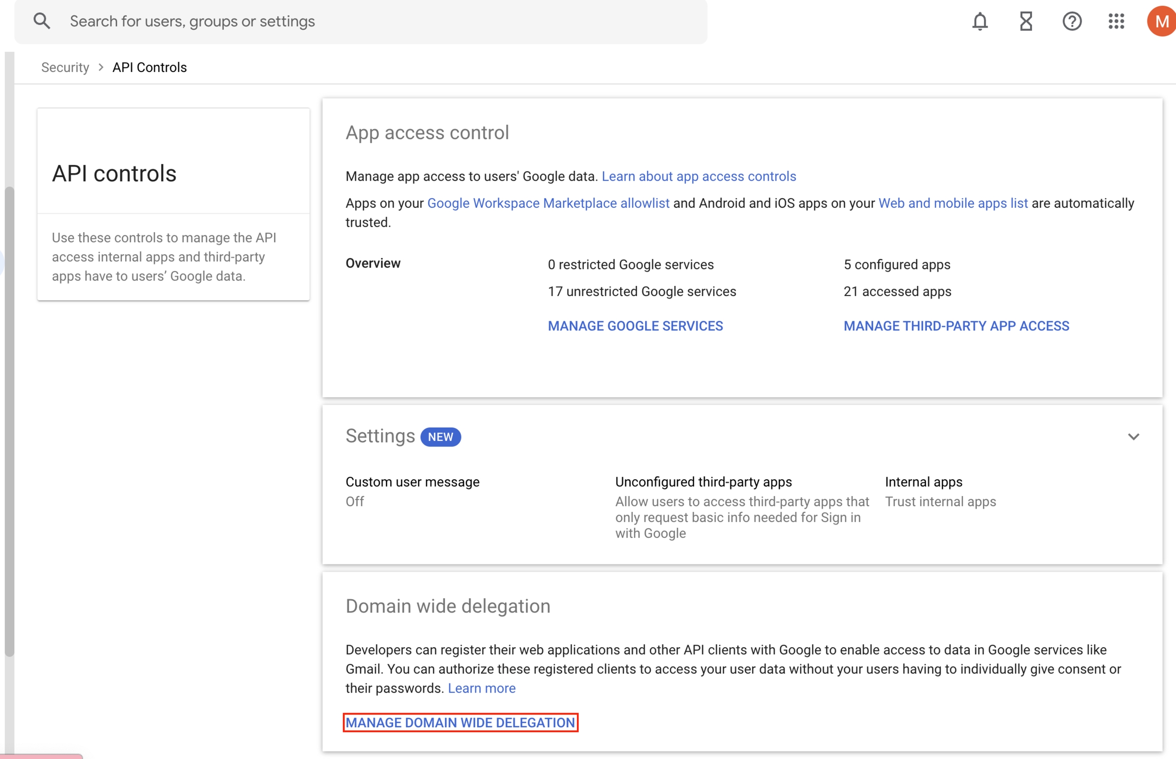 Click MANAGE DOMAIN WIDE DELEGATION under Domain wide delegation.
