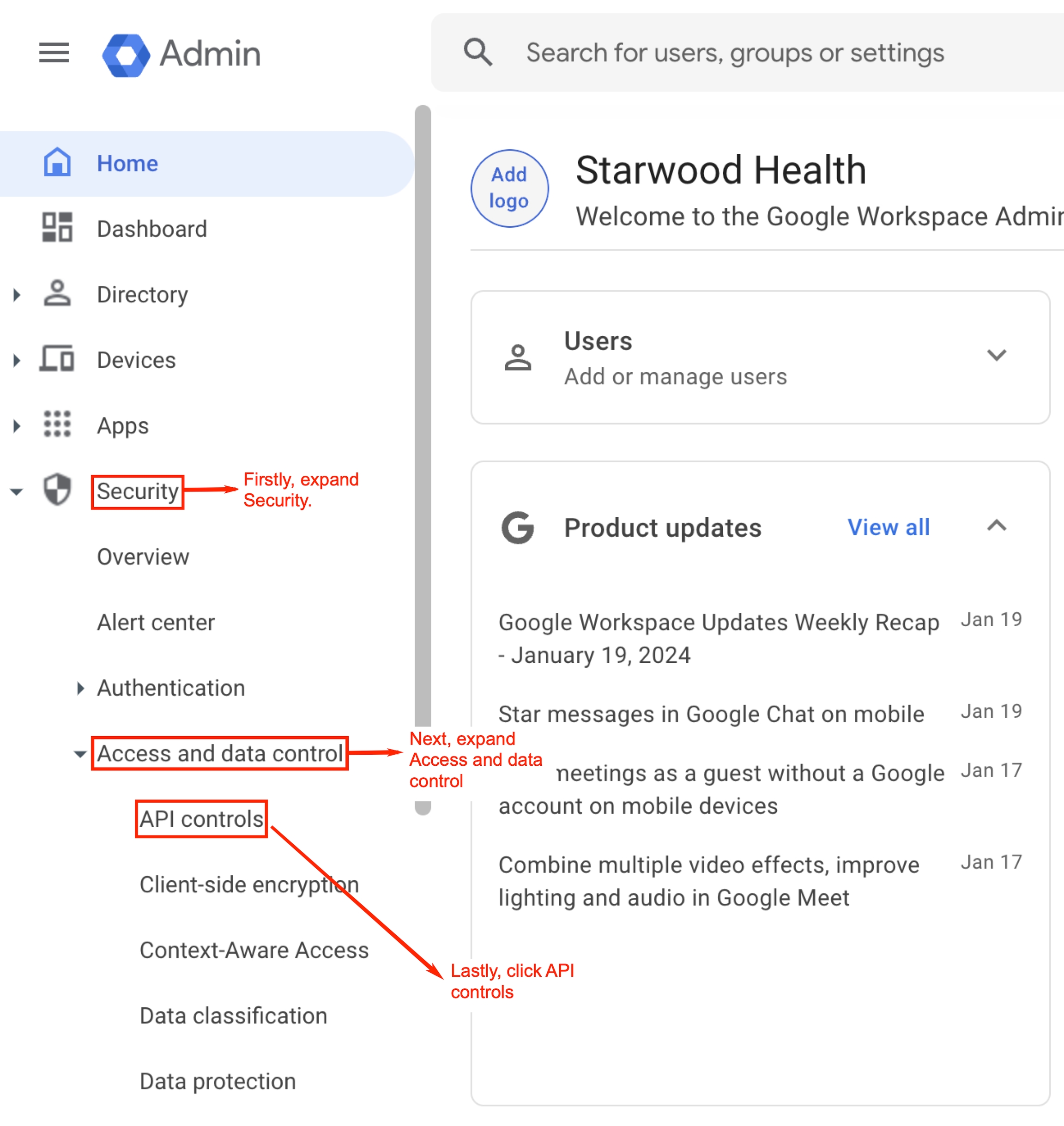 In the Admin console left pane, expand Security and then expand Access and data control.