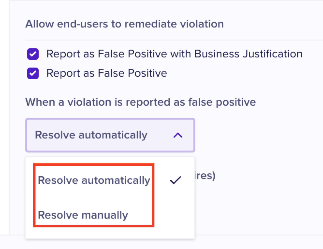When end-users report alerts as false positive, you can choose the resolution method to be either Automatic or manual.