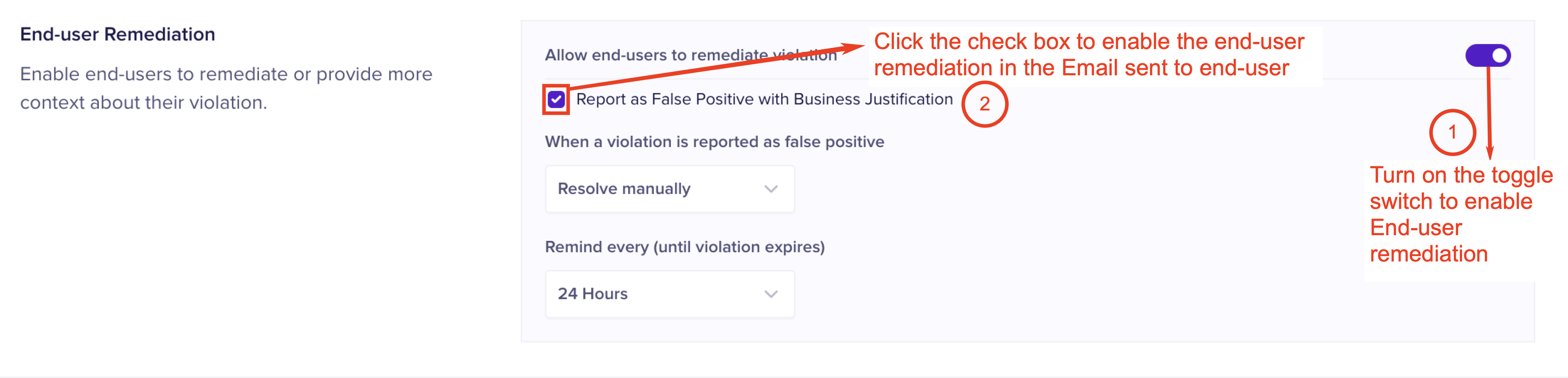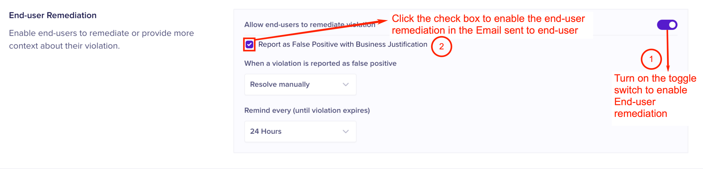 End-user remediation (also known as Human Firewall) allows you to configure remediation measures that end users can take, when a violation is triggered as a result of their actions. You must turn on the toggle switch to use this option. End-users receive the remediation actions in an Email as an action item. The various available remediation actions for end-users are as follows.
