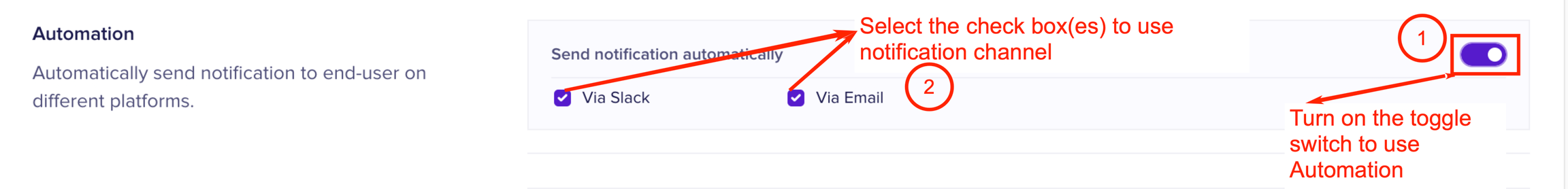 The automation settings allow you to send notifications to end users. You can select one or both the notification methods. You must first turn on the toggle switch to use the automation option. The automation notification channels are as follows