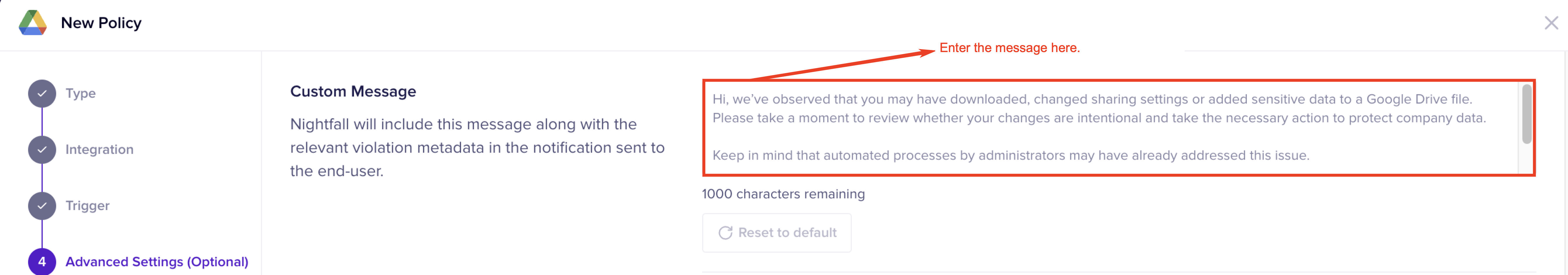 Enter a custom message to be sent to the end user. This message is sent in an Email. You can modify the default message provided by Nightfall and draft your message. The total character length allowed is 1000 characters. You can also add hyperlinks in the custom message. The syntax is <link | text >. For example, to hyperlink www.nightfall.ai with the text Nightfall website, you must write <www.nightfall.ai|Nightfall website>.