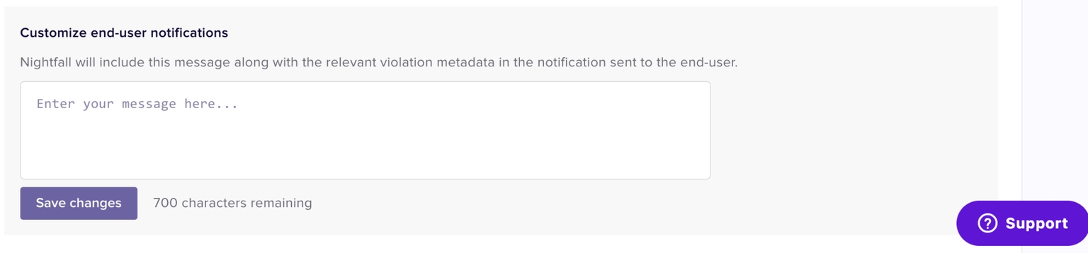 When a Violation occurs, Nightfall sends a notification to the end-user whose actions triggered the violation. While notifying the end-user, Nightfall also sends a text message. You can draft the text message to be sent to the end-user. This message applies to all the policies. Click Save changes once done.