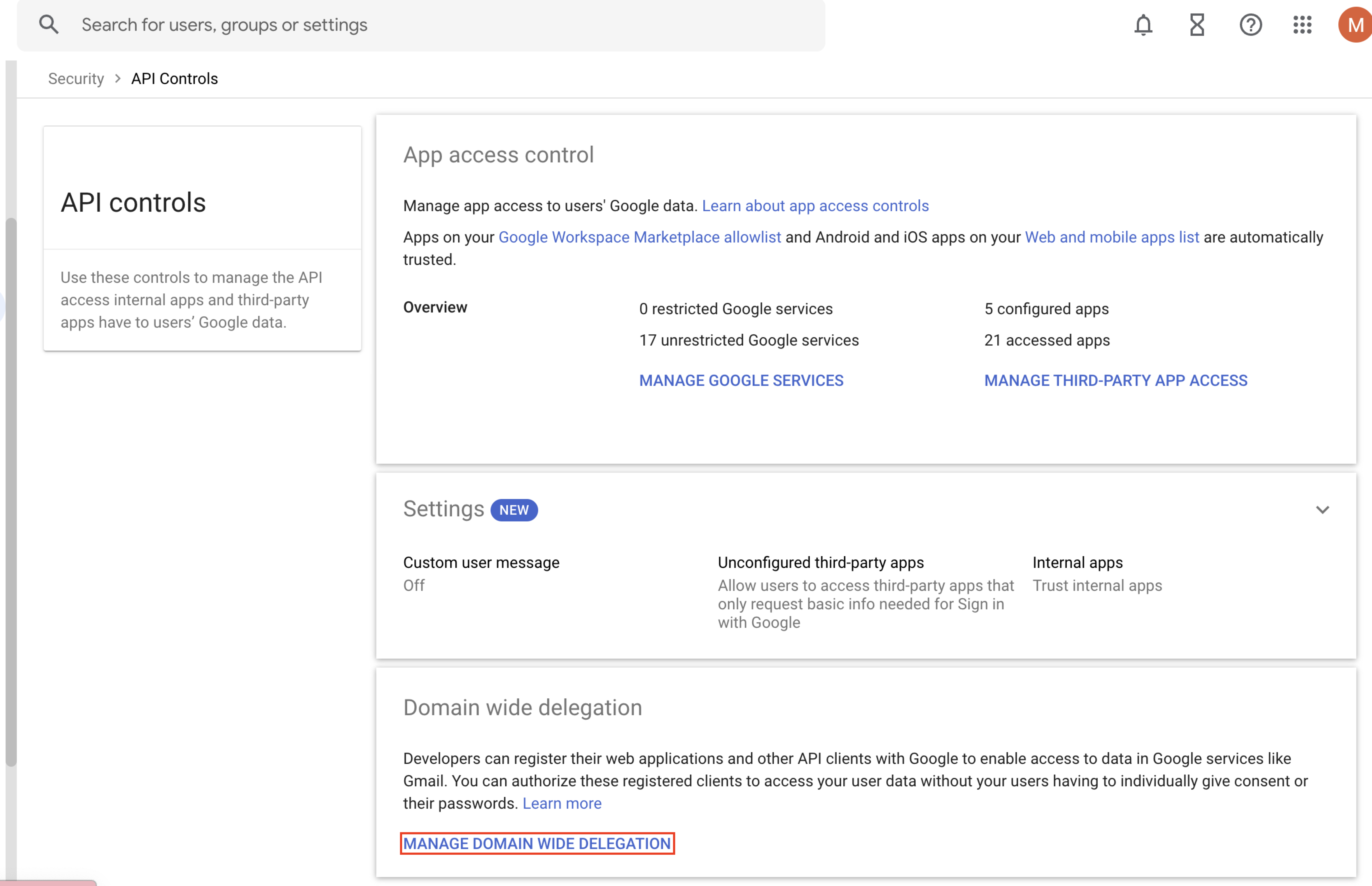 9. Click **MANAGE DOMAIN WIDE DELEGATION** under **Domain wide delegation**.