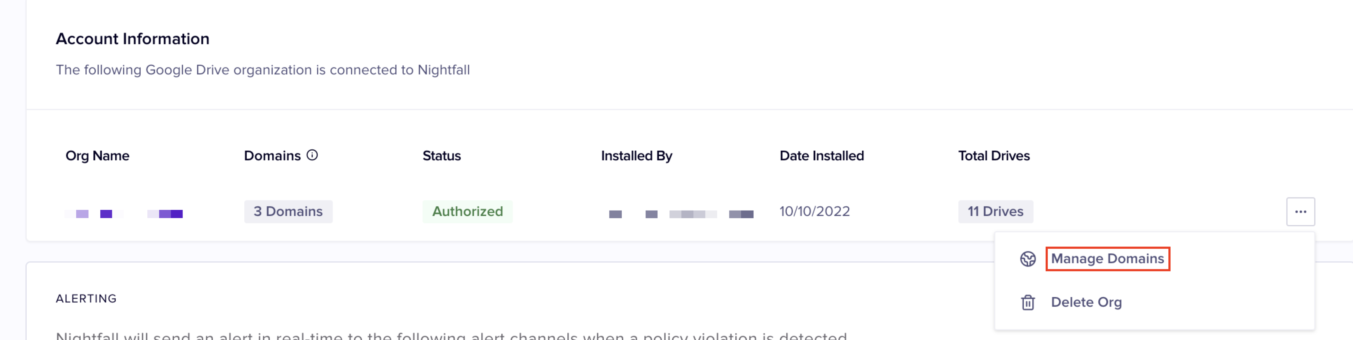 Once the installation is completed, Nightfall connects to your Google Workspace account and fetches all the domains. In the above image, you can see that 3 domains are fetched. These three domains were already present in your Google Workspace and are considered to be internal. You can add additional domains by clicking the ellipsis menu at the right end and selecting **Manage Domains**.