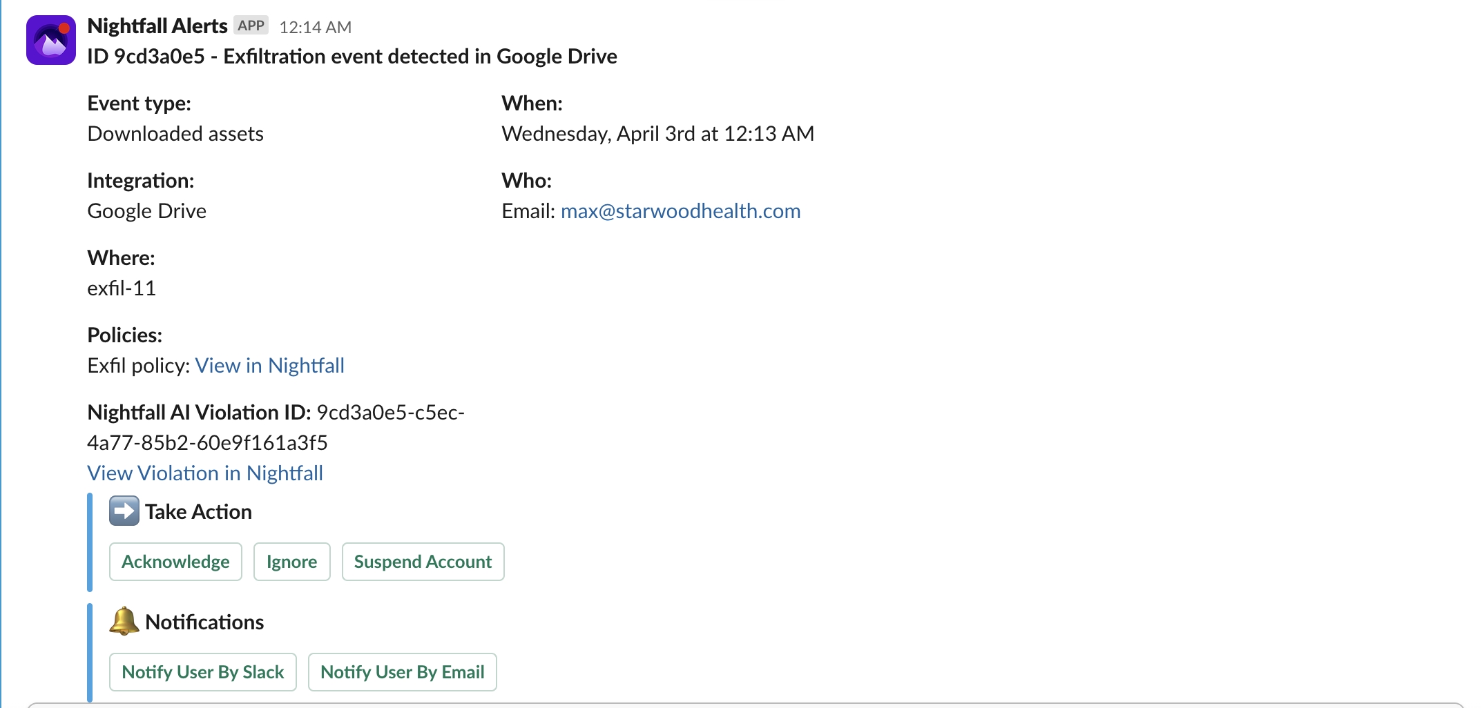 Also, a Slack message is sent if you have enabled the Slack alerts for the Nightfall admin. The Slack message looks as shown in the following image.