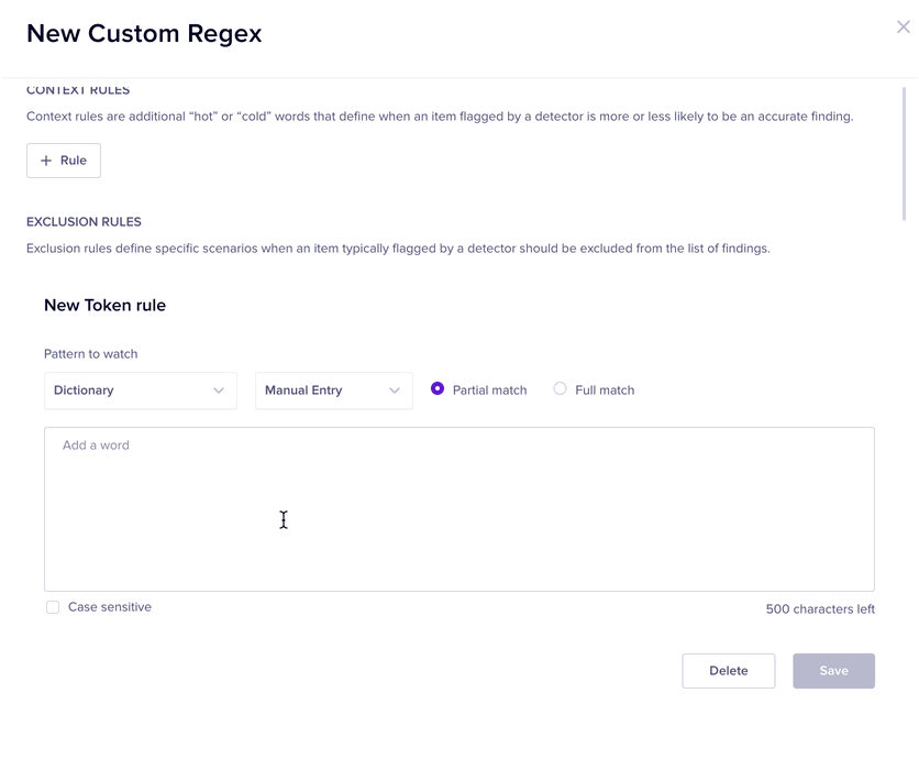 If you are facing a hard time creating regular expressions for content that needs to be excluded, you can use the dictionary option. This option allows you to define phrases that must not be considered as sensitive data. You can use this option to directly define commonly used passwords, dummy API keys, and so on.