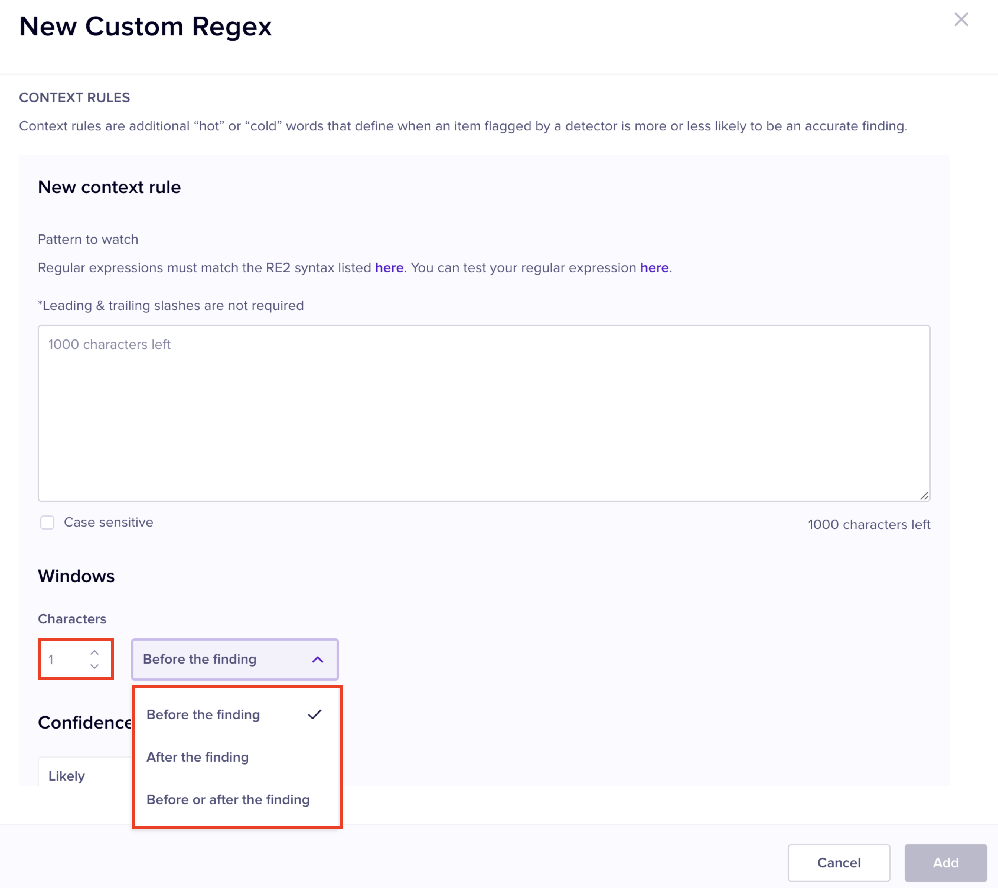 Windows Setting: Once you create the regular expression to define the possible phrases that can surround the sensitive data, you can use the Windows setting to instruct Nightfall as to where exactly this surrounding text can exist around the sensitive data (before, after). Nightfall provides you the following Windows settings.