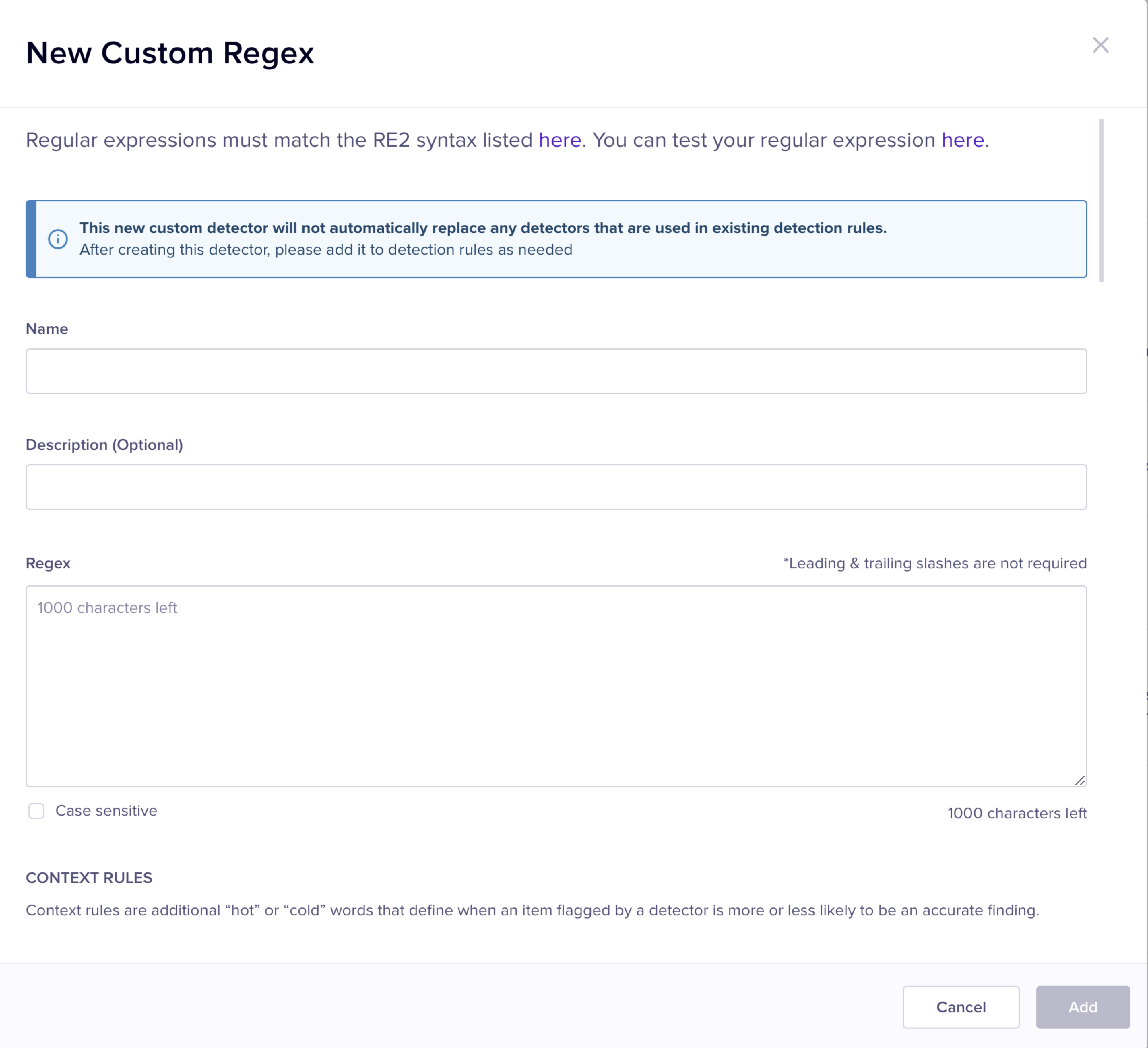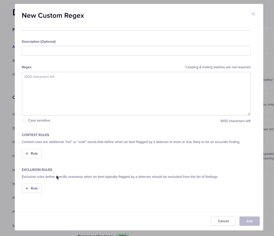 To use the Regular Expression detector effectively, Nightfall provides you with two special rules; Context Rules and Exclusion Rules. When Nightfall scans your data and finds some sensitive data, these rules are used to further scrutinize the sensitive data to be sure that the data is sensitive. Context rules and Exclusion rules are optional and you can define them only if you wish to have added filtration on sensitive data to be sure that data that is termed as sensitive, is sensitive.