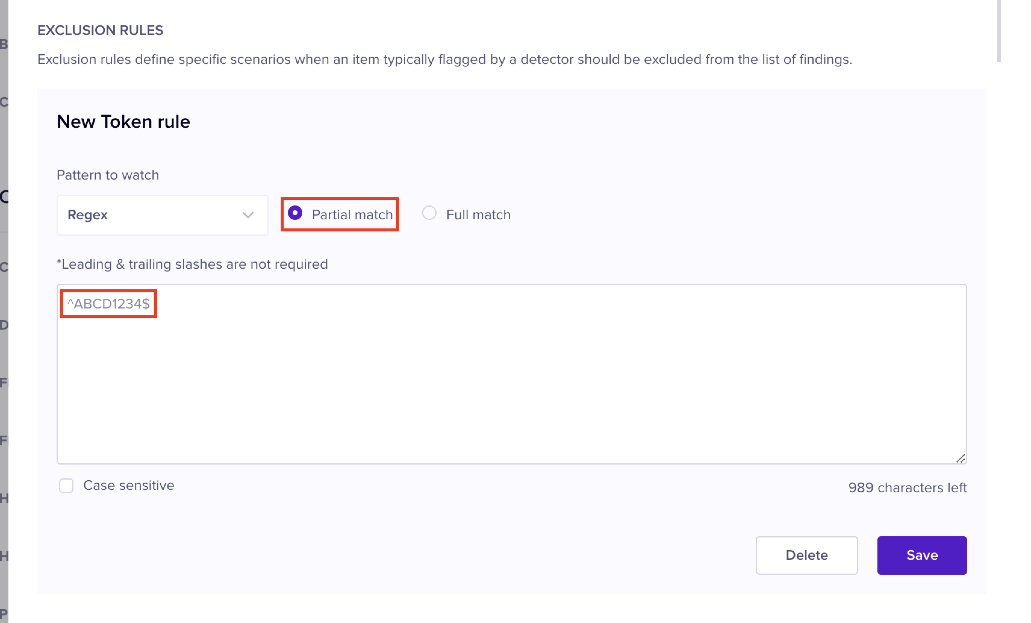For example, consider that one of your prospective customer is testing your API and you need to share an API key for this testing. You create a series of dummy API keys (say ABCD1234, ABCD2345, ABCD3124, ABCD5412, and so on). You can create a regular expression to match each of these dummy APIs and select the Full match option. Nightfall does not treat any of these as sensitive data and excludes them.