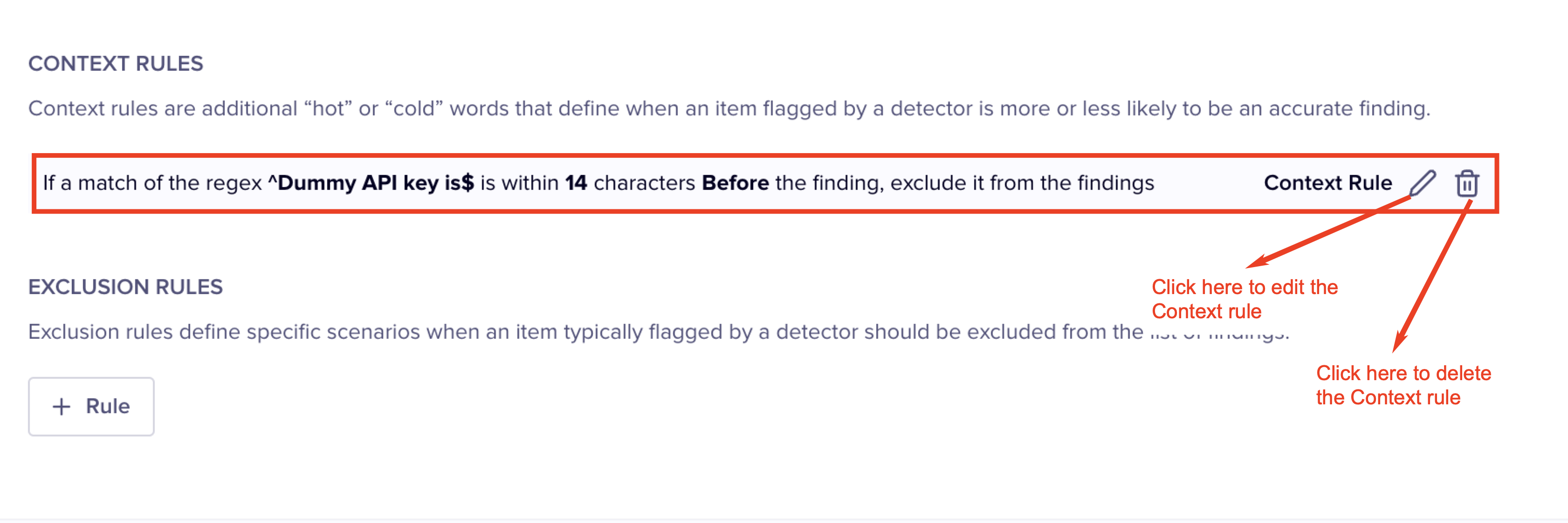 Exclude: If you set the Confidence Change setting to Exclude, Nightfall does not consider the prospective Finding to be actually sensitive (even though it matched both; sensitive data's regular expression and also the Context rules' regular expression and Windows setting) and excludes it from Findings. You can use this setting to eliminate false positive findings. For example, consider that one of your prospective customer is testing your API and you need to share an API key for this testing. You share a dummy API key and do not wish this API key to be flagged as sensitive data. You can ask your employees to draft a specific phrase before sharing the API key (something like, the dummy API key is ). You can then define a context rule for this phrase, set the Windows setting to define where exactly it can be found, and then set Exclude as the Confidence change setting, to exclude this dummy API key from being flagged as sensitive data.