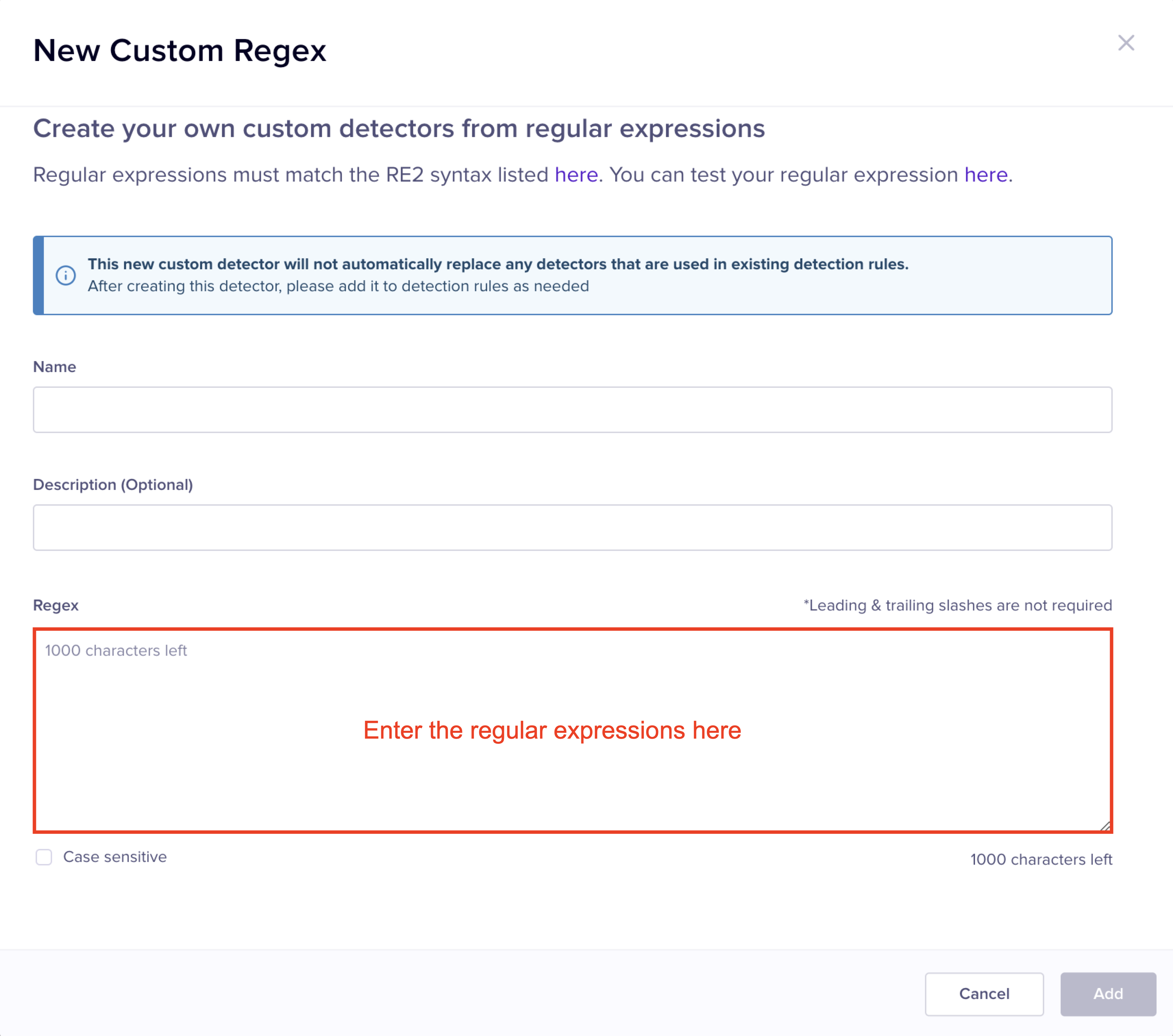 A regular expression detector allows you to define a regular expression pattern. Once you define a pattern, Nightfall scans your data to check if there is anything that matches the given pattern. If a match is found, it is flagged as sensitive data. You can also refer to this link to generate regular expressions.