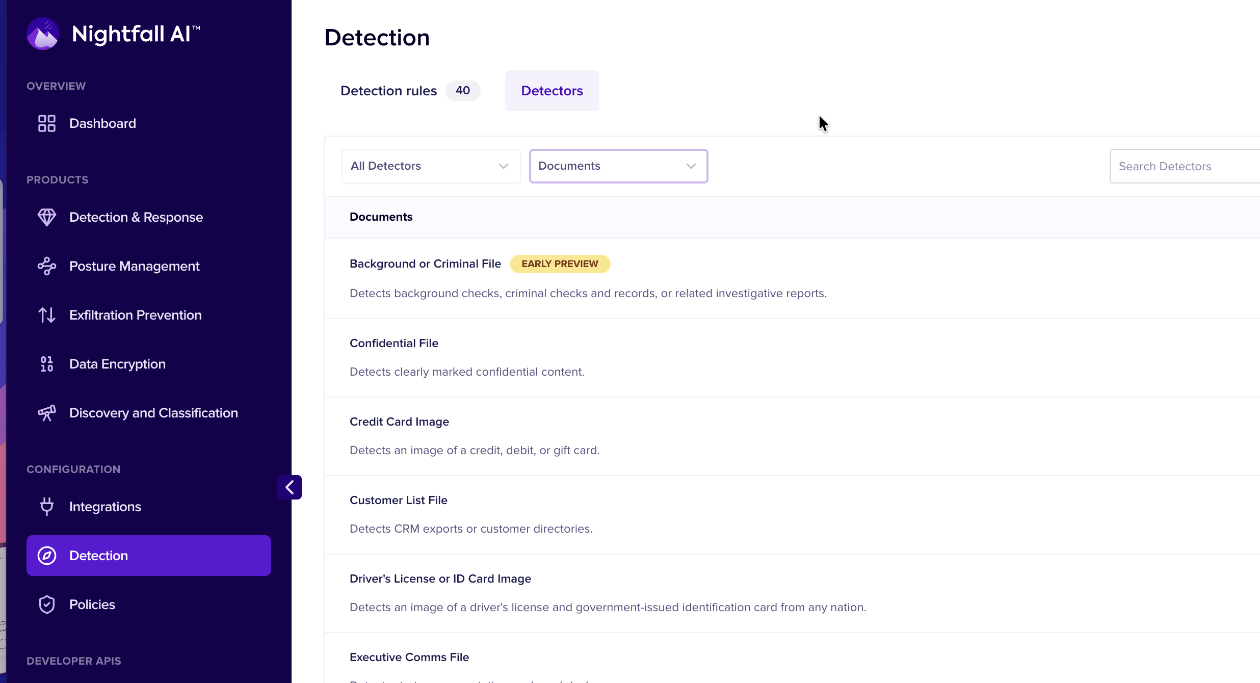 Nightfall provides a comprehensive library of **machine learning–powered detectors** that identify sensitive data across text, images, files, and source code with 90%-95% precision out of the box. All detectors are available immediately in your workspace under **Detection → Detectors**
