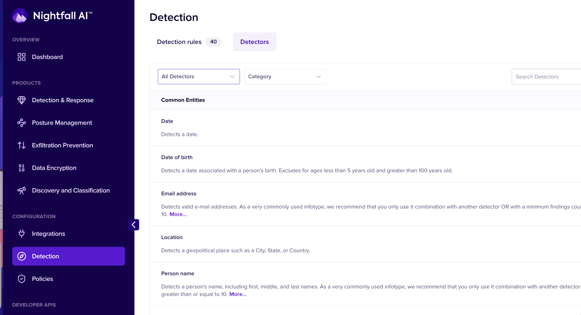 For the complete list of all the detectors present in all the categories, you can view the [detection\_glossary](https://help.nightfall.ai/detection_platform/detection_glossary "mention") document.&#x20;