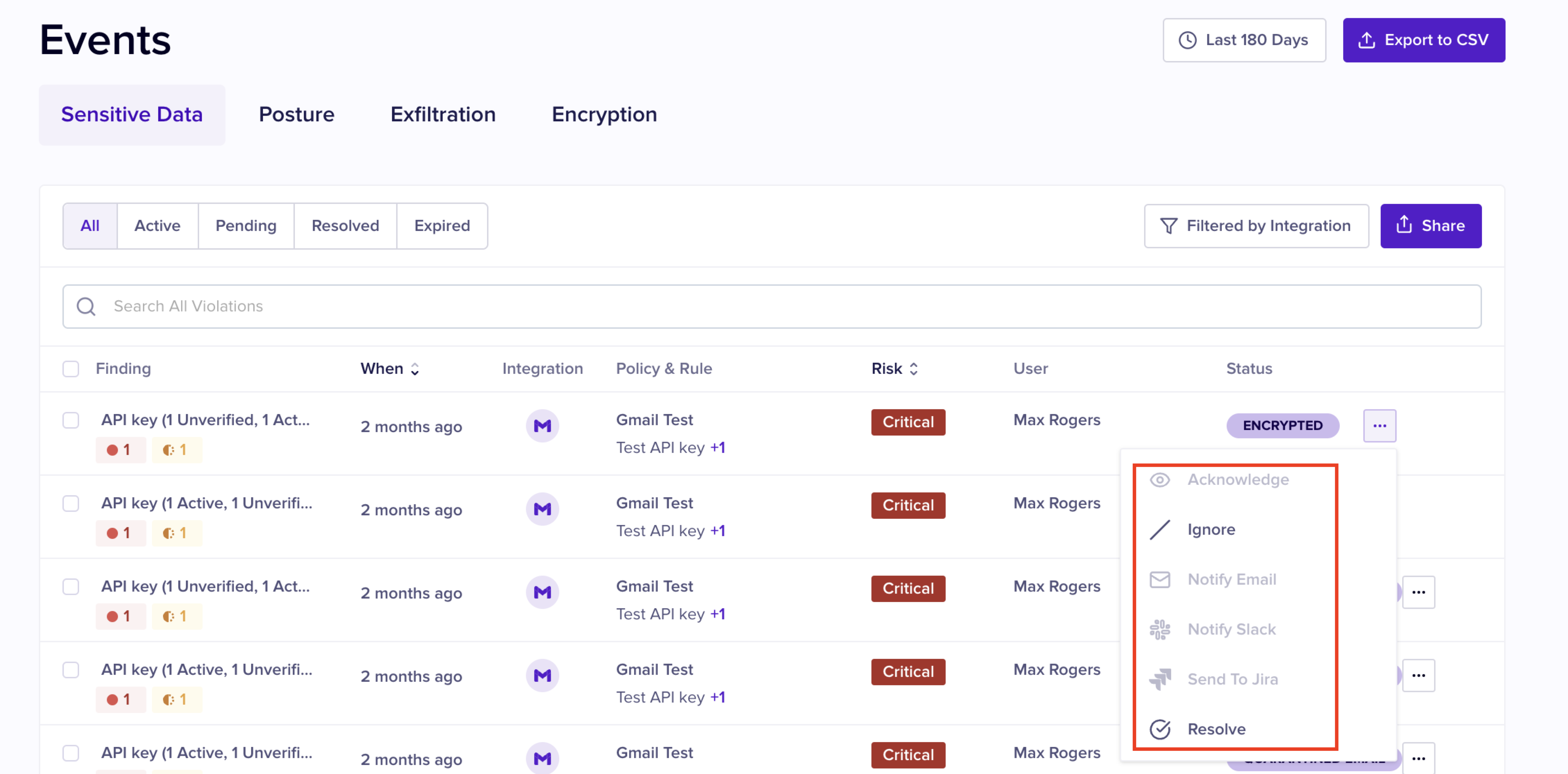 * **Resolve**: This action must be taken when the sensitive data is removed completely. This action resolves the Event.