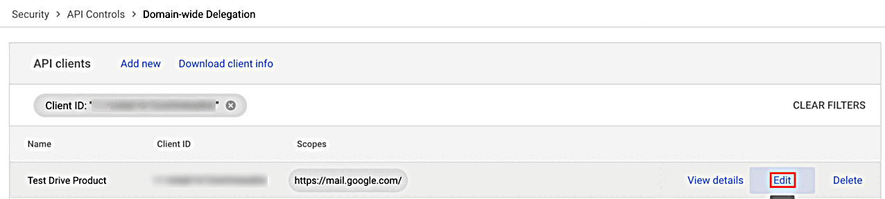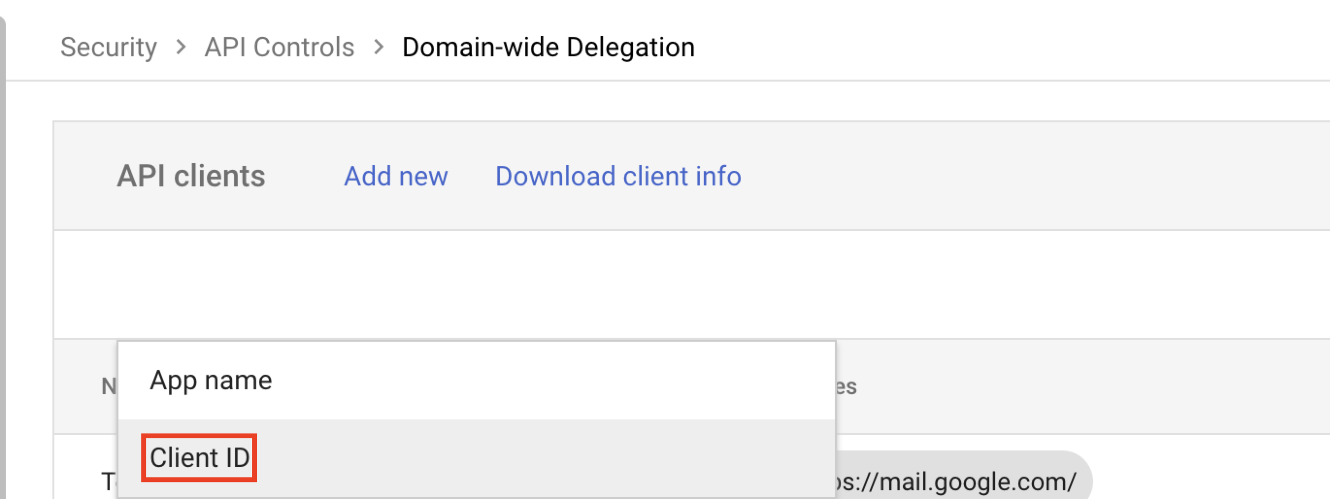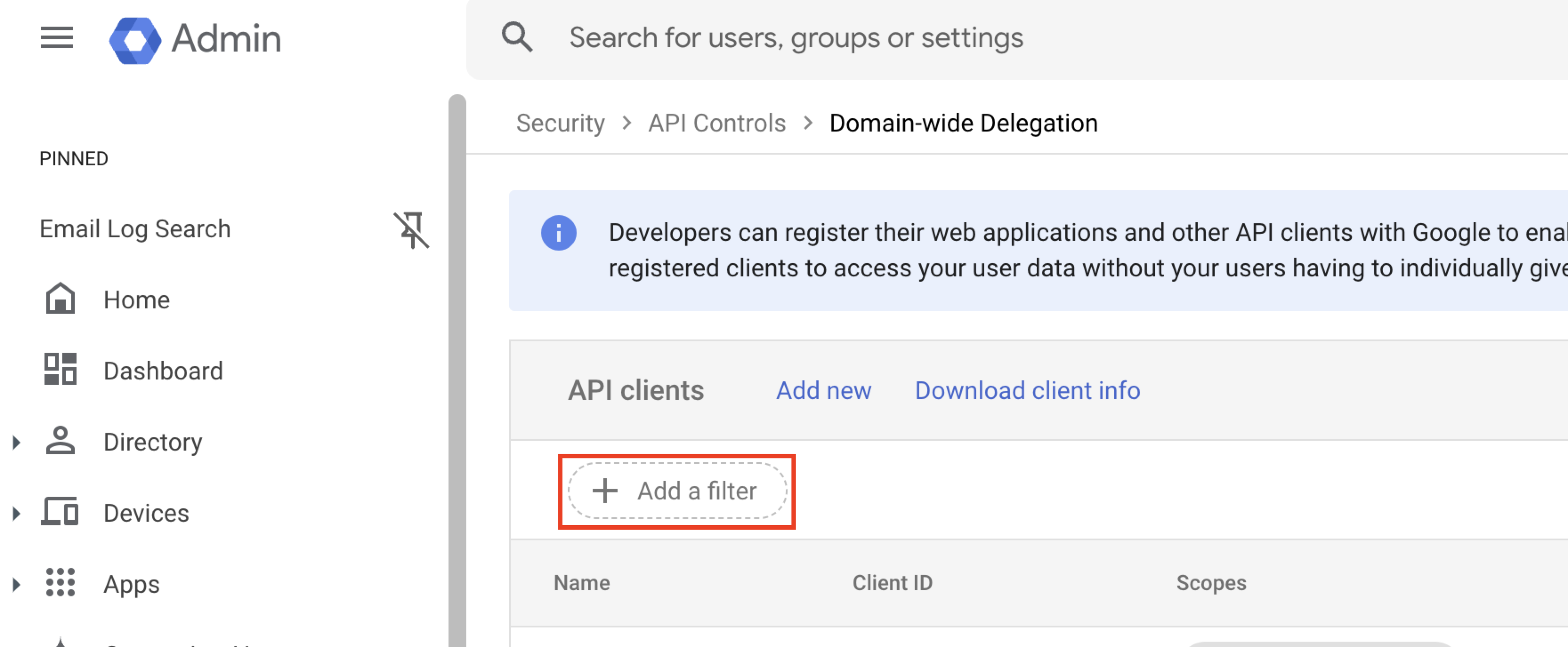2. Navigate to [Domain wide delegations](https://admin.google.com/ac/owl/domainwidedelegation).