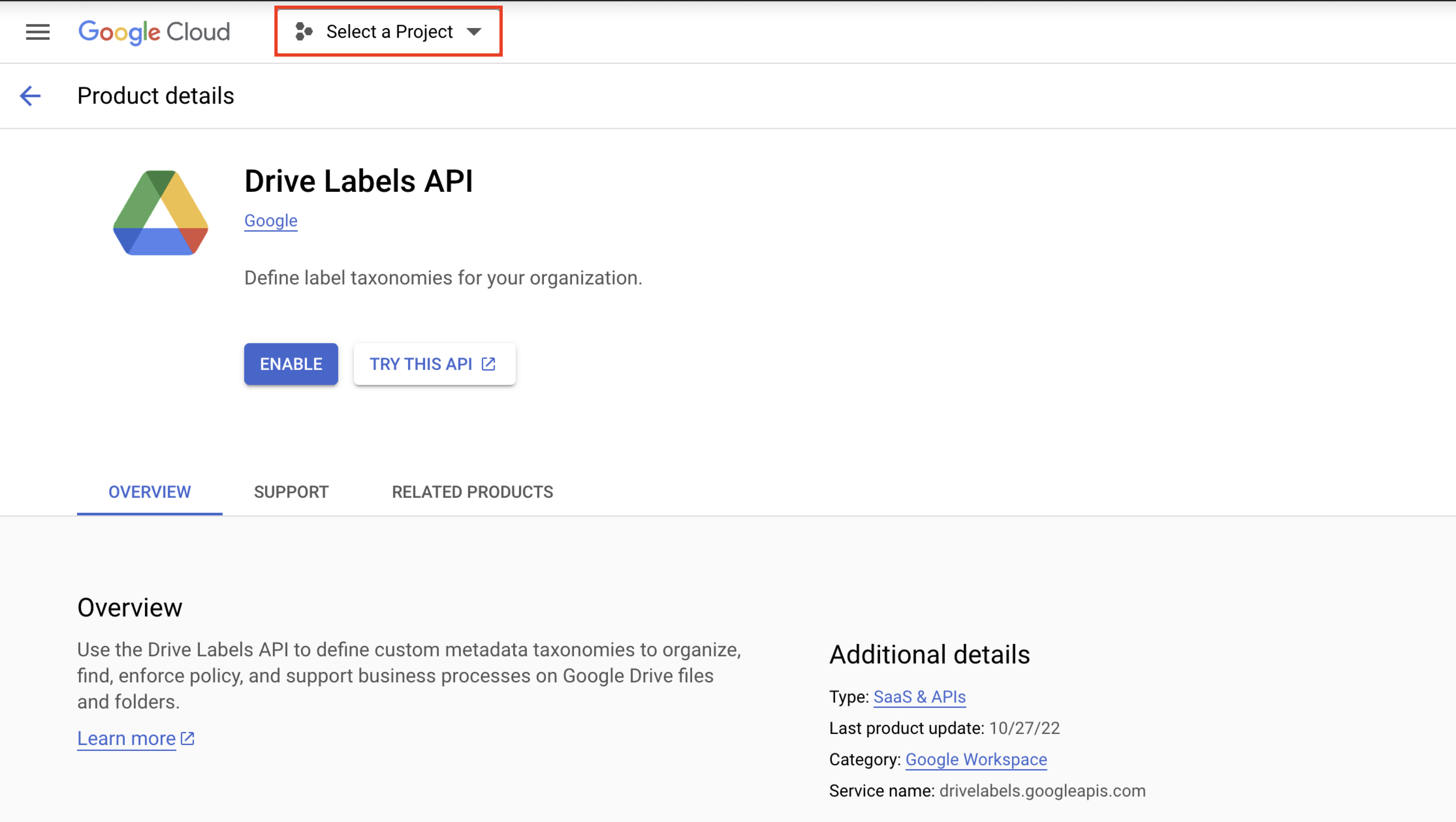 1. Navigate to the Google Drive Labels API from the GCP console that can be found [here](https://console.cloud.google.com/apis/library/drivelabels.googleapis.com).&#x20;