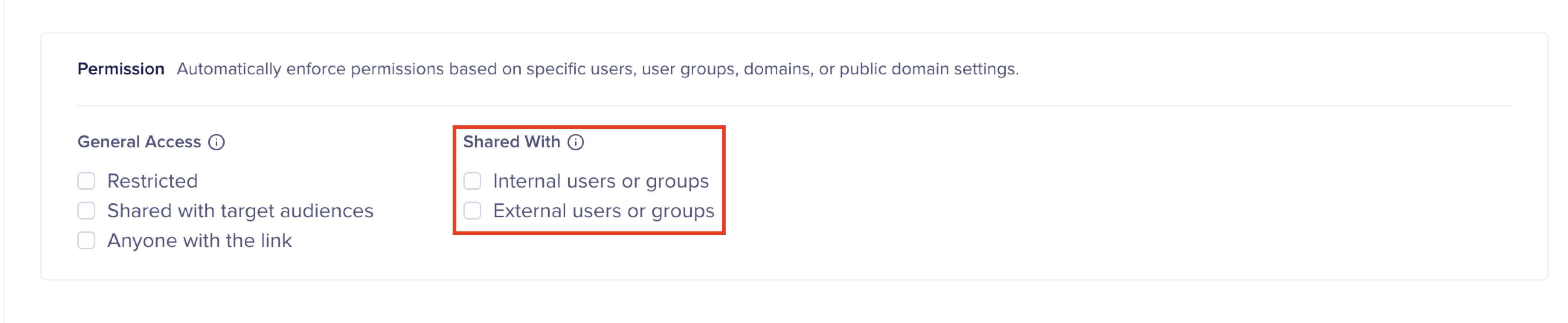 Permission: This section allows you to select files with specific permissions, shared with any internal or external users or user groups.