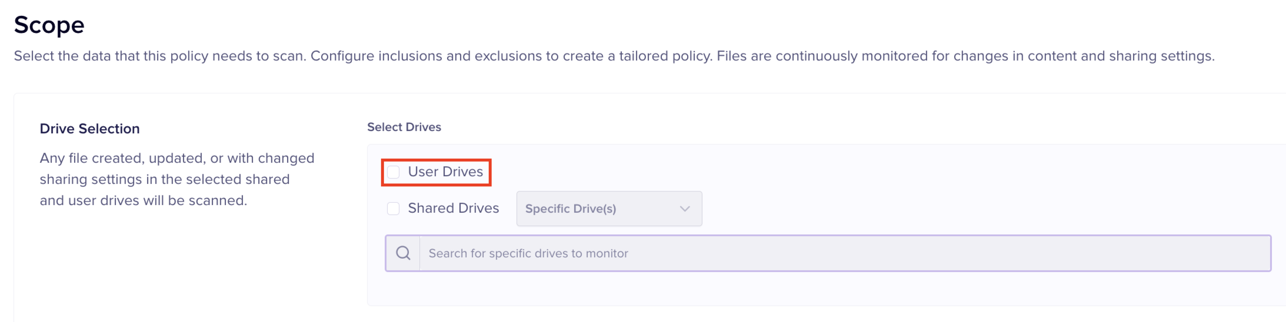 If you choose to monitor the User drives, all the User drives in your Google domain are selected for monitoring. You do not have the option to choose specific User drives for monitoring.