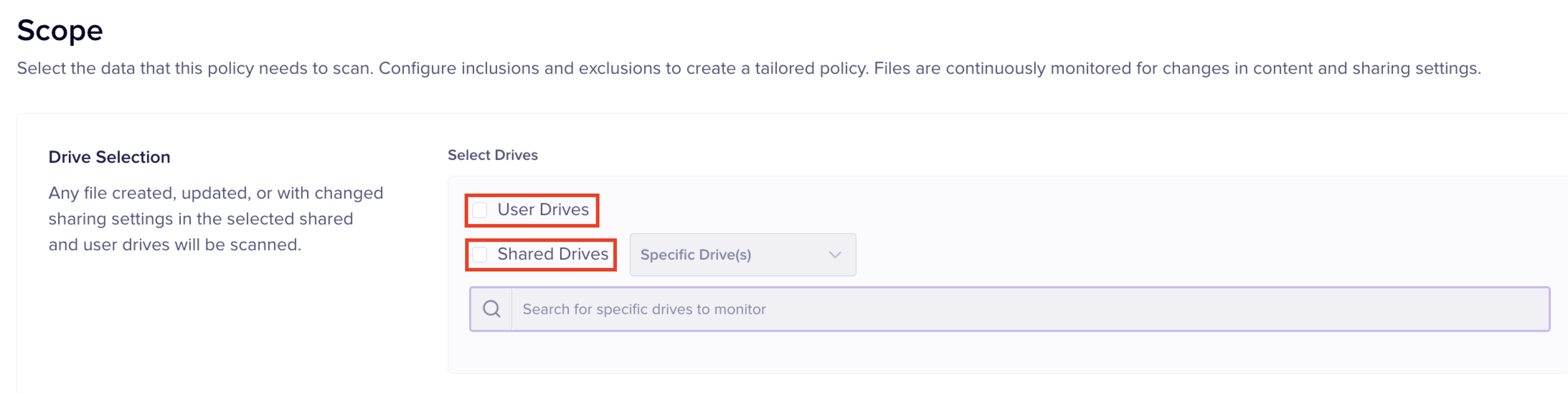 Learn how you can configure the Scope section in a policy, created in Nightfall for Google Drive.