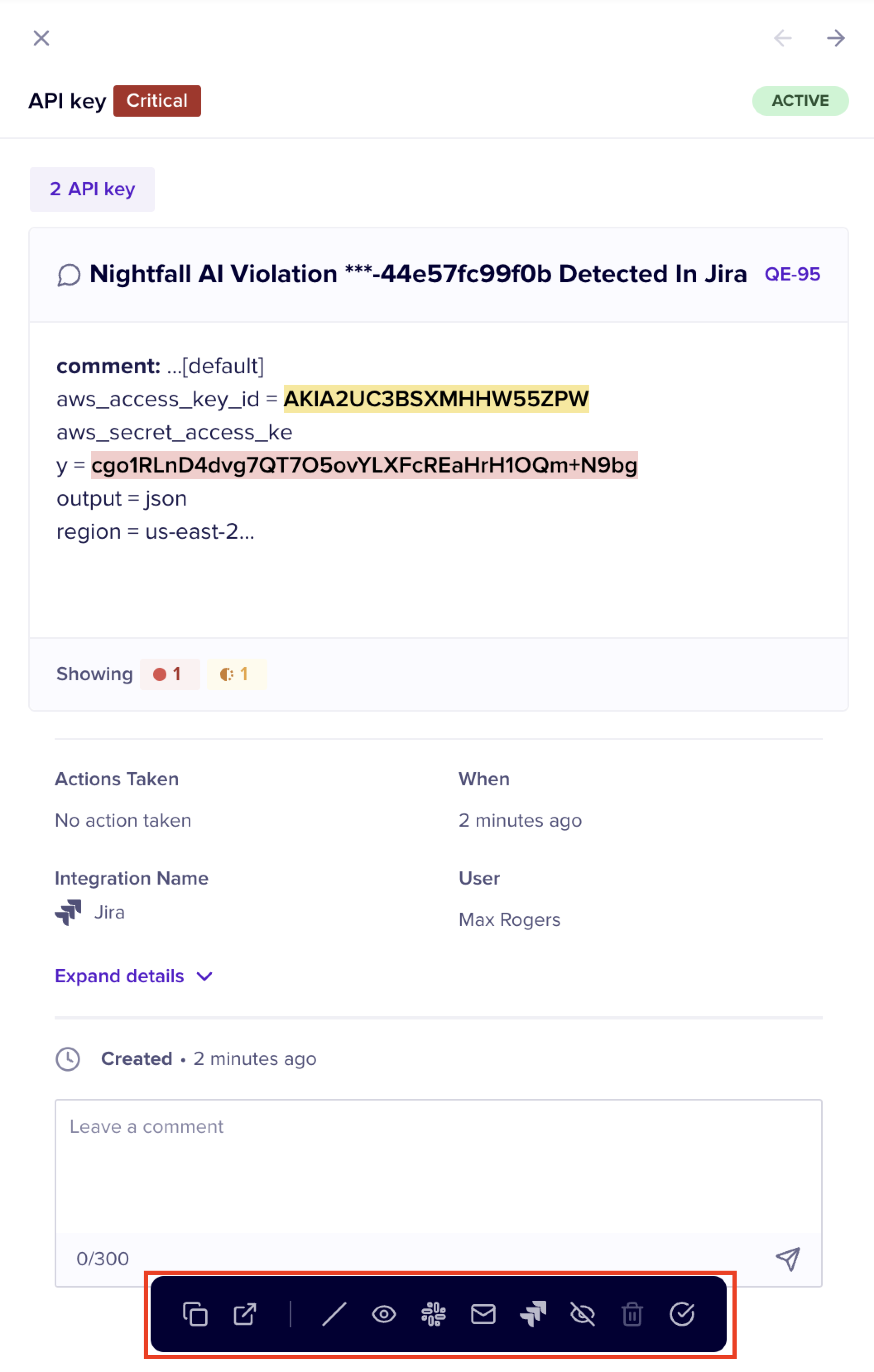 * **View in JIRA**: This action redirects to the sensitive data in the source JIRA ticket. While this action is available only on the Event detail view, please note that relevant access to the source of sensitive data in JIRA should be present.