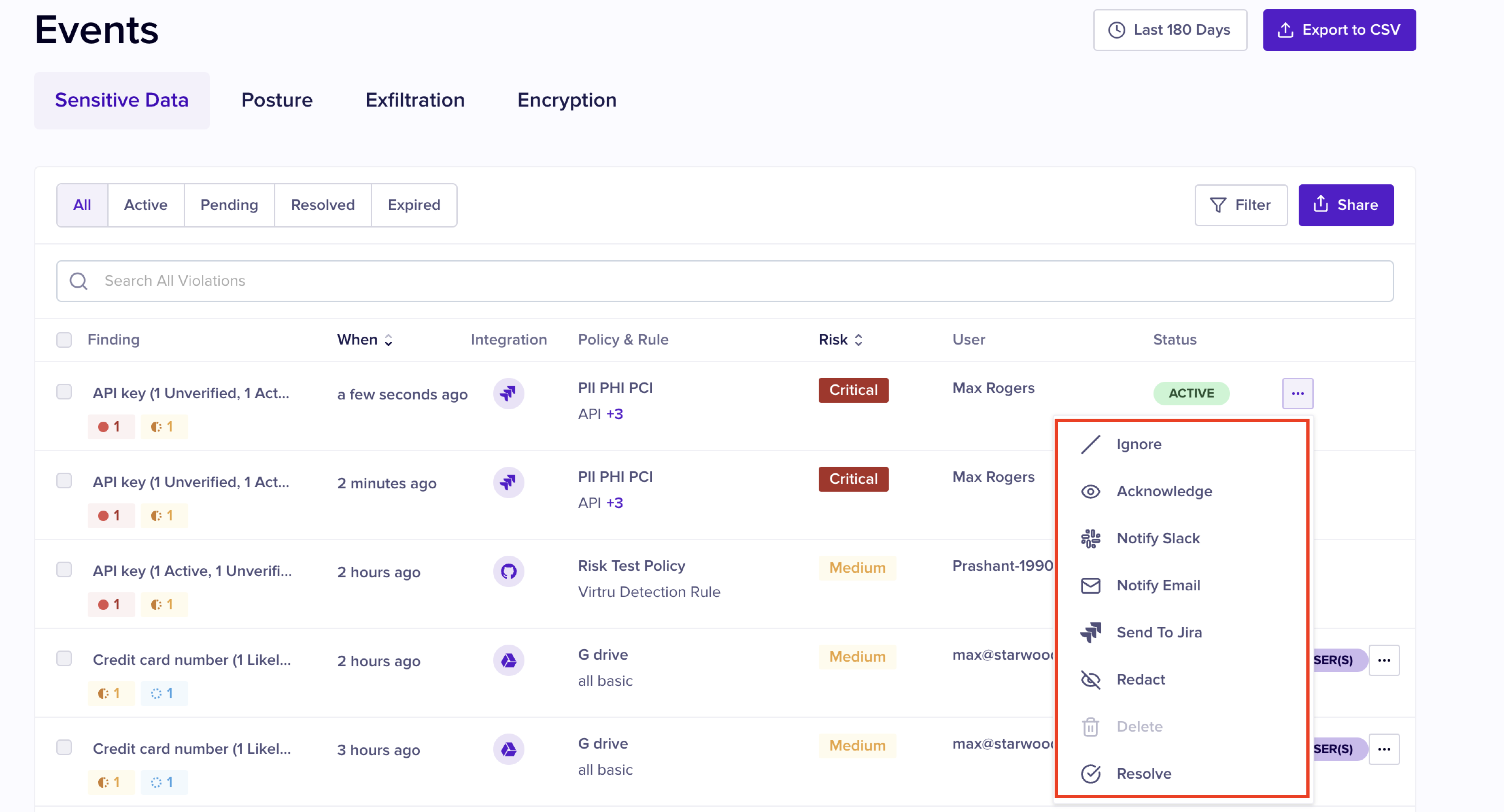 * **Resolve**: This action must be taken when the sensitive data is removed completely. This action resolves the Event.