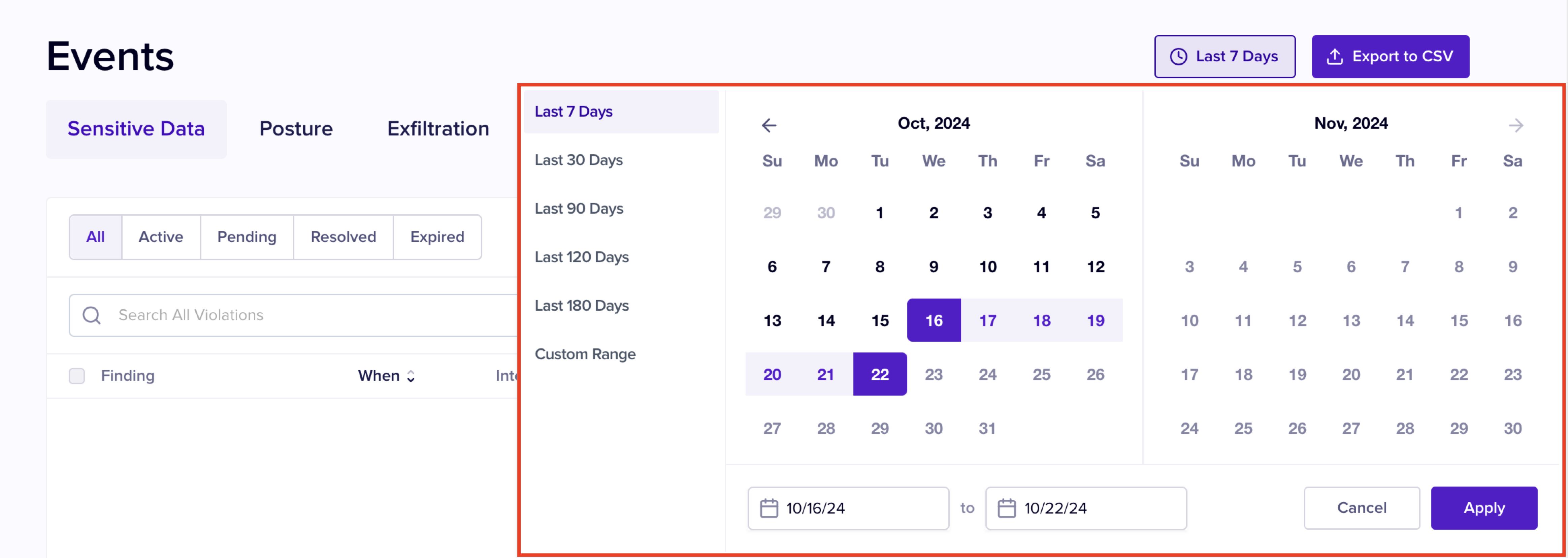 2. (Optional) Modify the days filter to view Events prior to last 7 days. By default the Events recorded in the **Last 7 Days** are displayed.