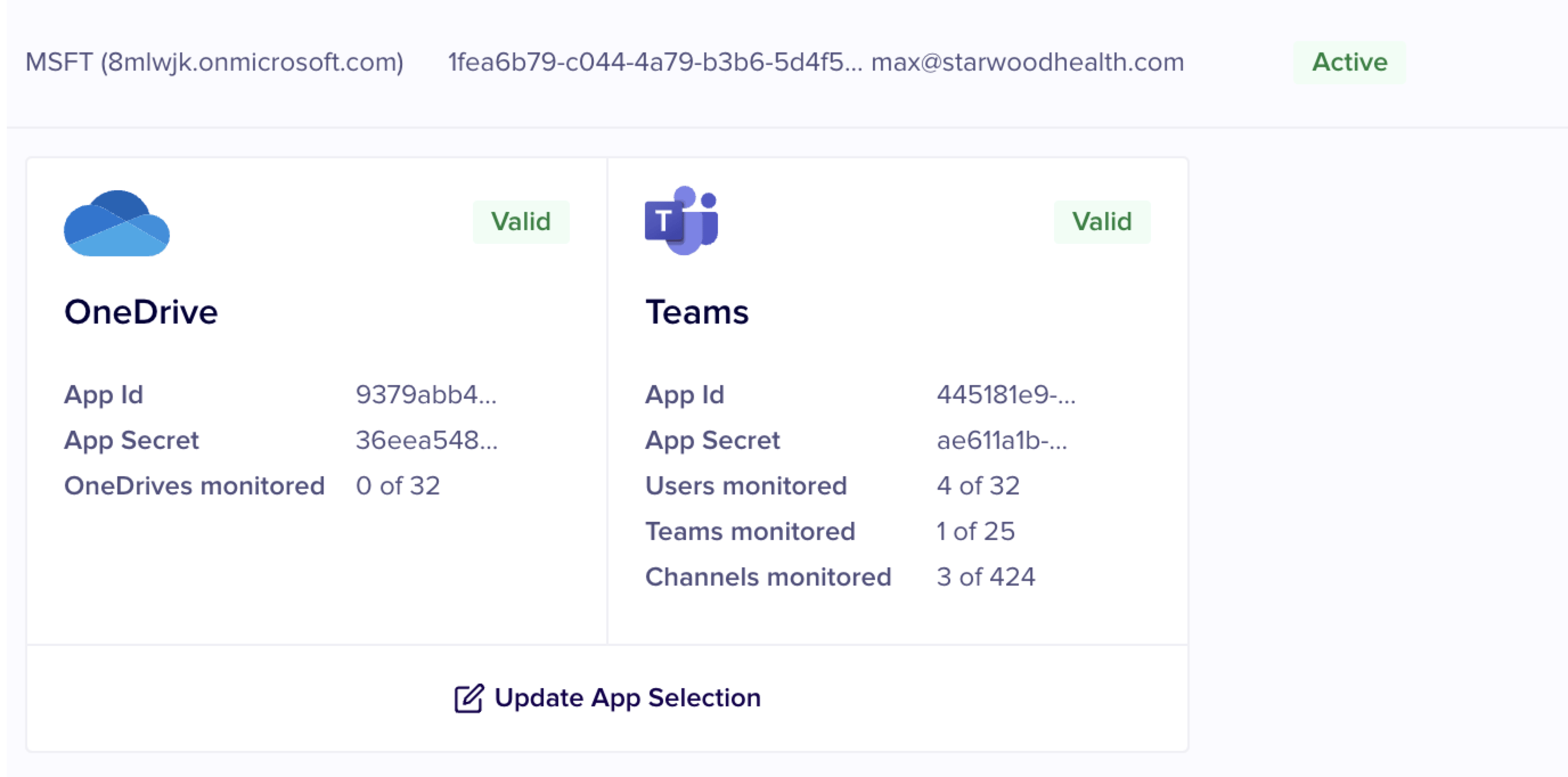 If you have not connected either the OneDrive or the Teams application in step 6, the **Connect** button is displayed against the app. You can click the **Update App Selection** button to connect to the app.&#x20;