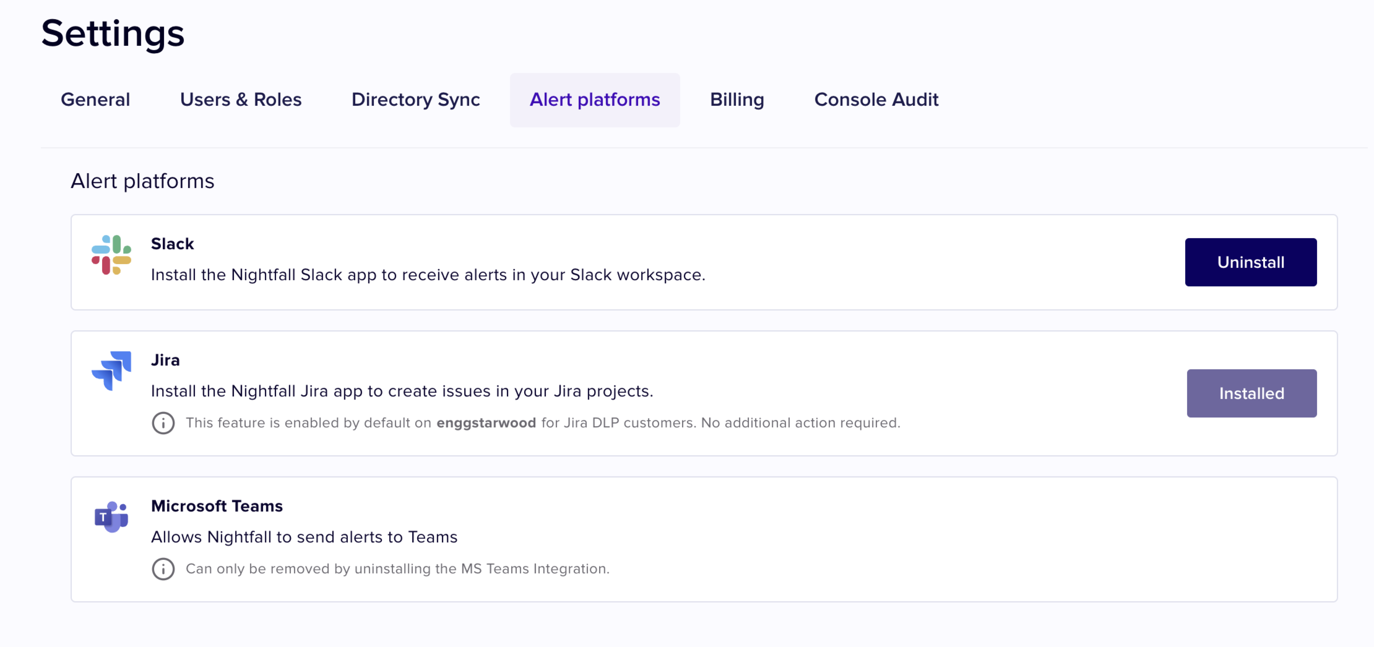 The **alert management** permission allows users to configure alert platforms. These alert platforms can be used as notification channels while configuring integrations or  creating policies for an integration.
