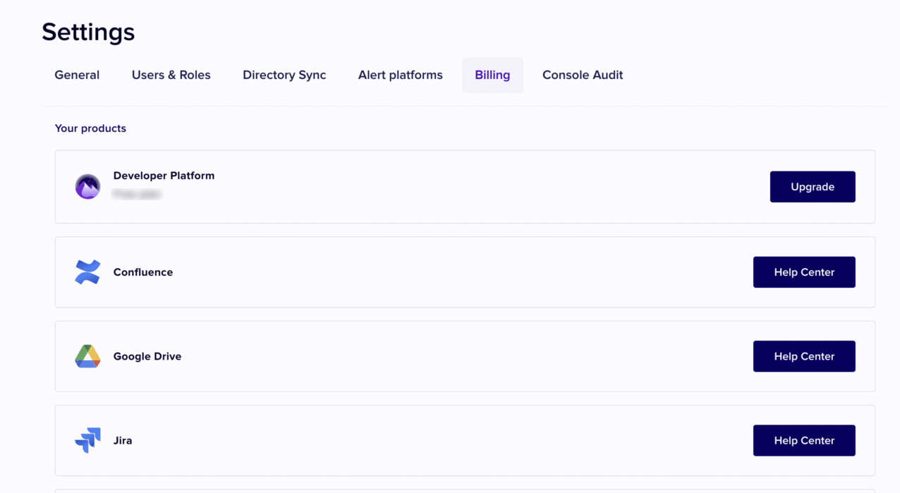 The Billing page allows users to view their current plan and other details related to the current plan. Users can also view the integrations also view the Nightgall products being used by the organization.&#x20;