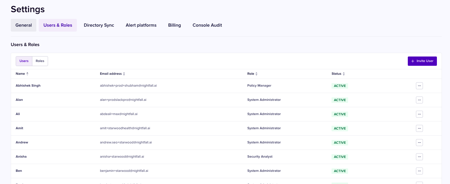 The User management page allows you to add or remove users to the Nightfall application. A Nightfall admin has the privileges to add or remove users to the Nightfall console. To perform user and Roles related activities, you must navigate to the Users and Roles page.