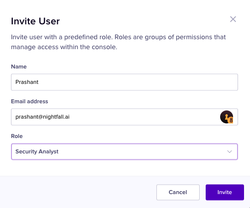 4. Select a role for the user from the role drop-down menu. Refer to the [role\_based\_access\_control](https://help.nightfall.ai/nightfall_settings/role_based_access_control "mention") document to learn more about user roles.&#x20;