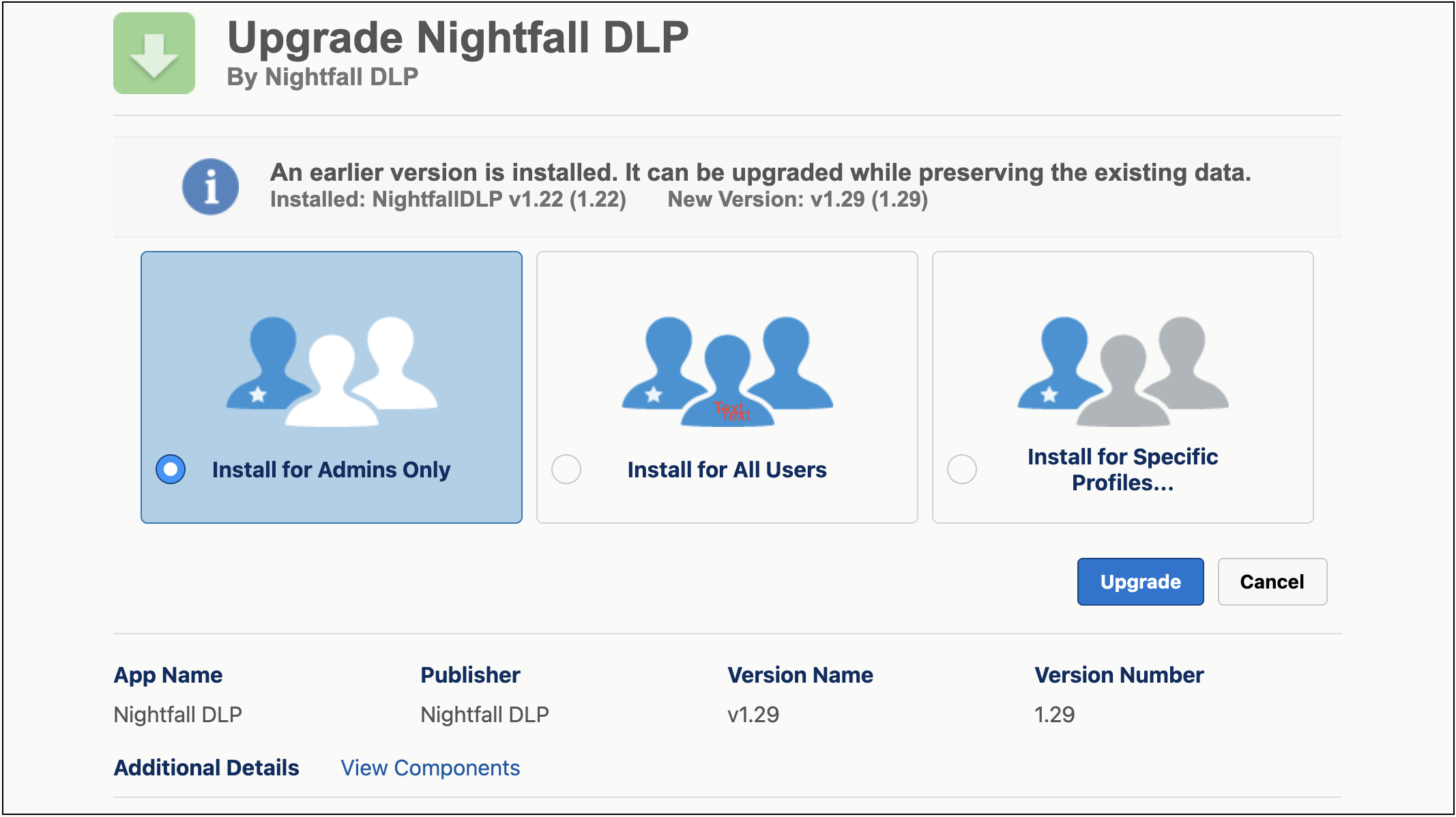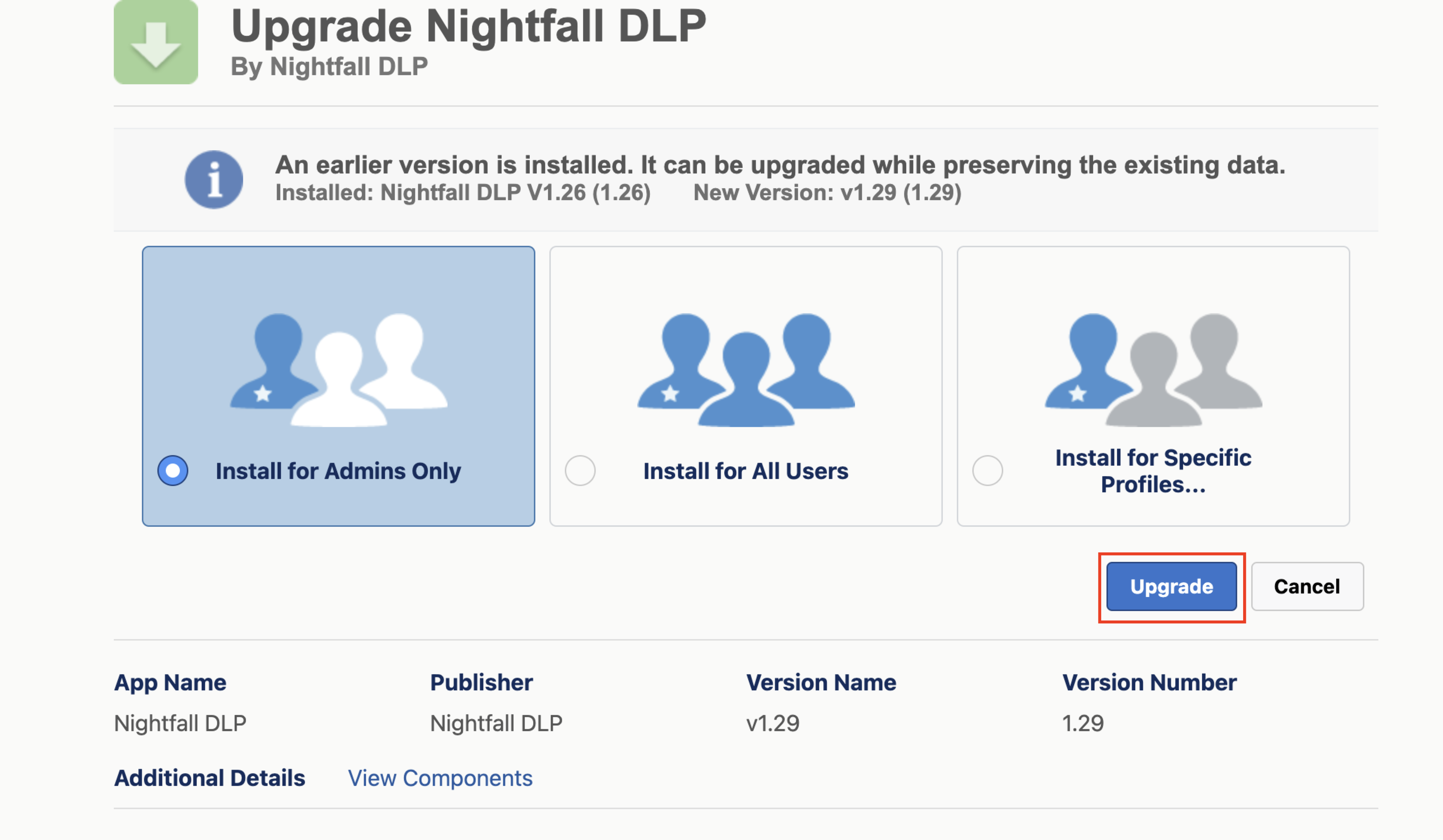 Select Install for Admins Only to install the upgrade package only to Salesforce admin users.
