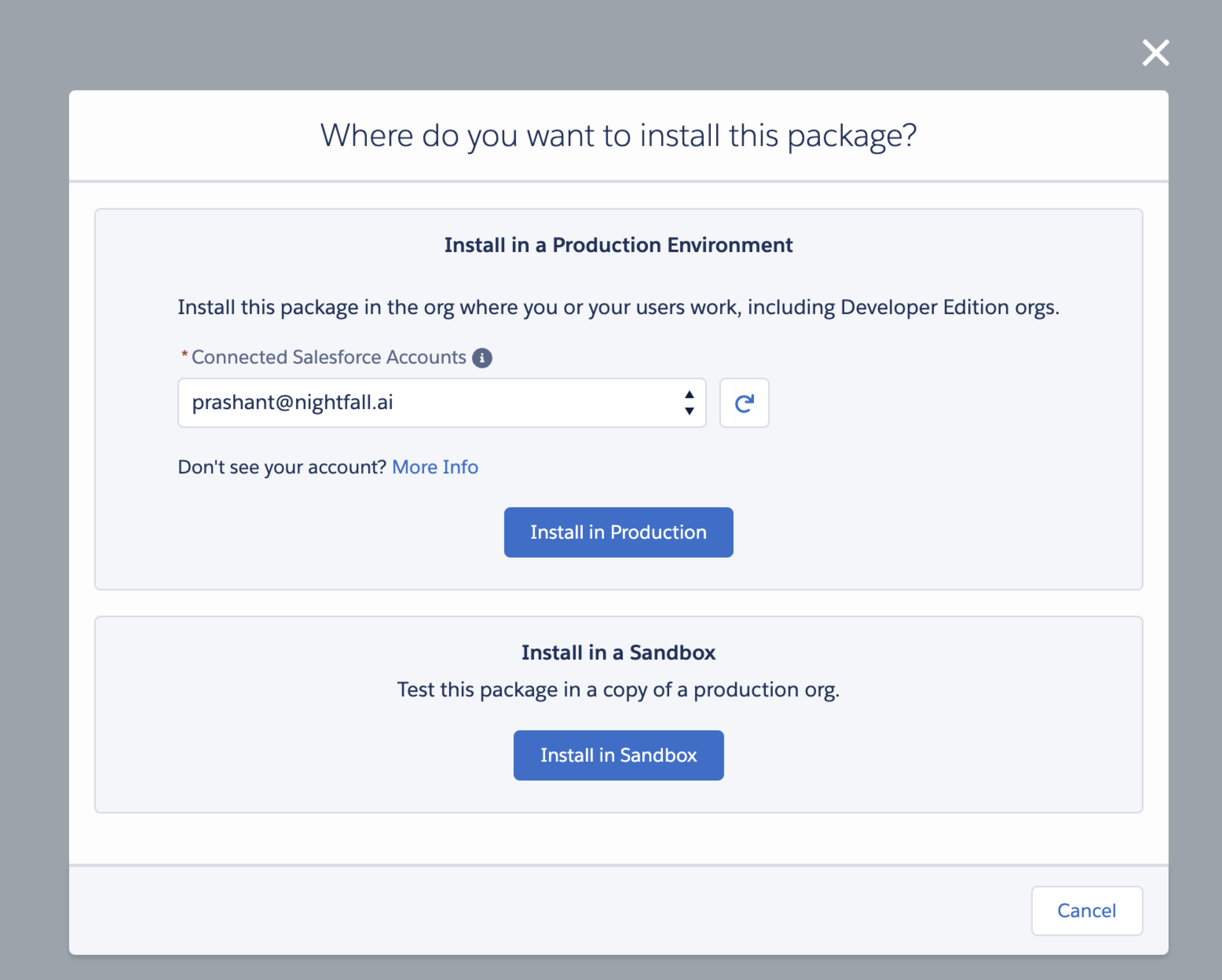 Click Install in Production or Install in Sandbox, based on the selection you made in the previous step.