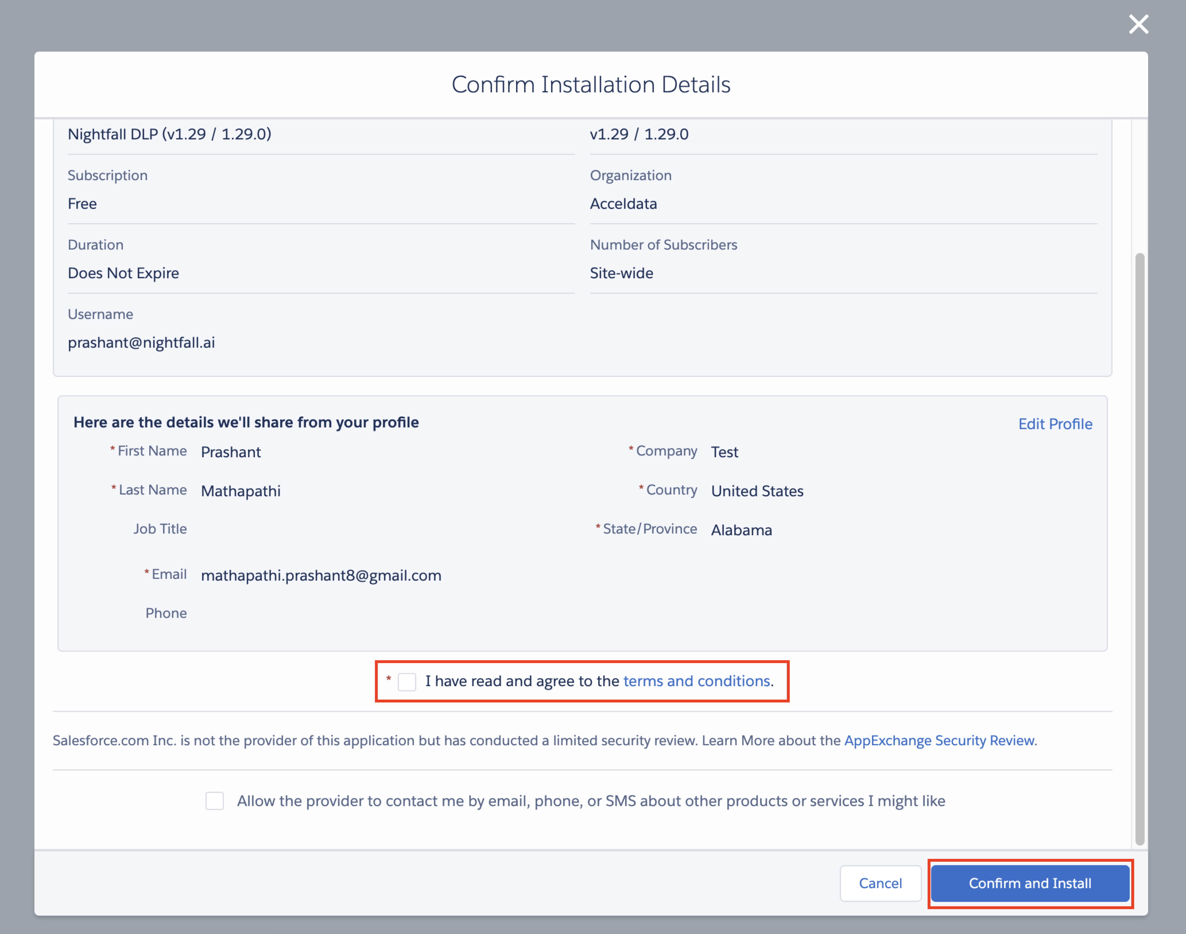 Agree to the Terms and Conditions check box and click Confirm and Install.