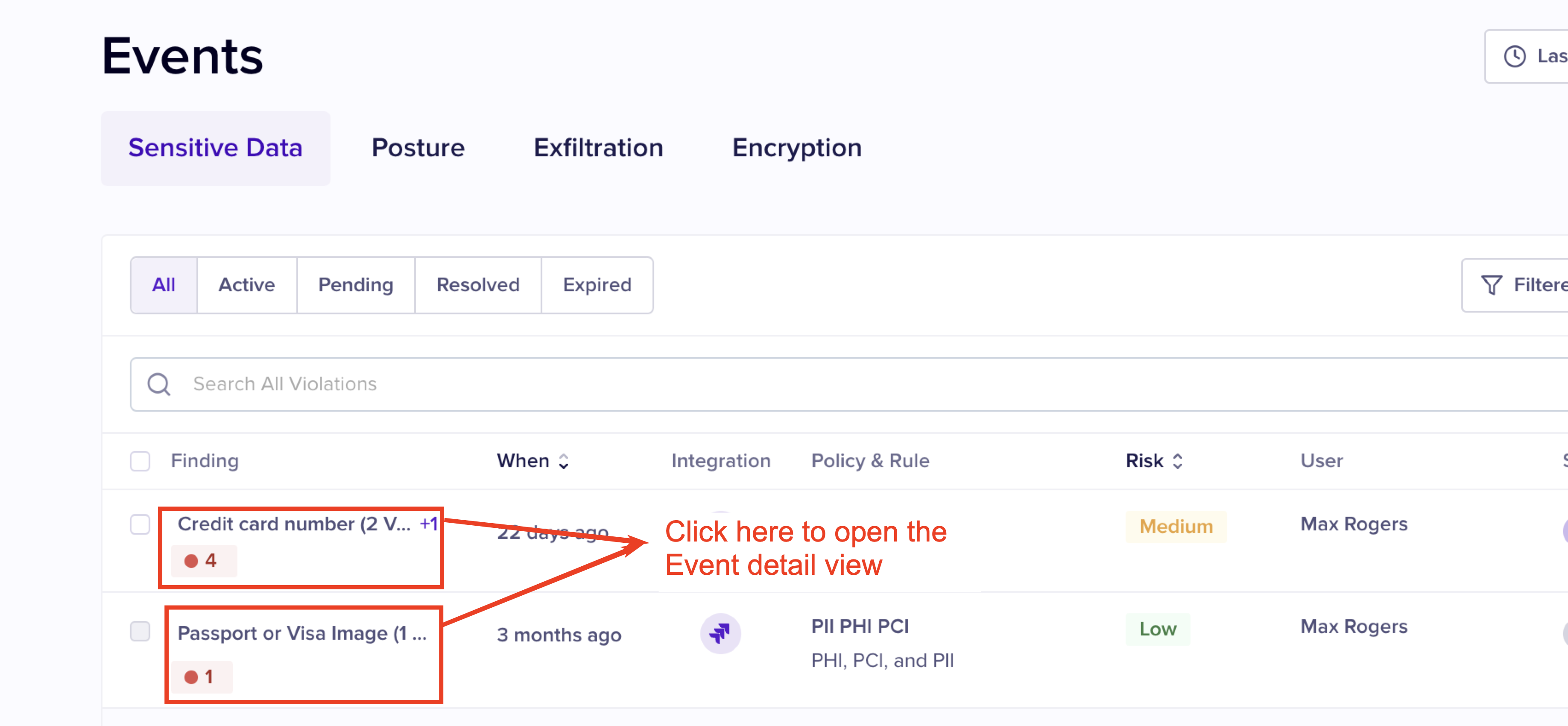 * **Resolve**: This action must be taken when the sensitive data is removed completely. This action resolves the Event.