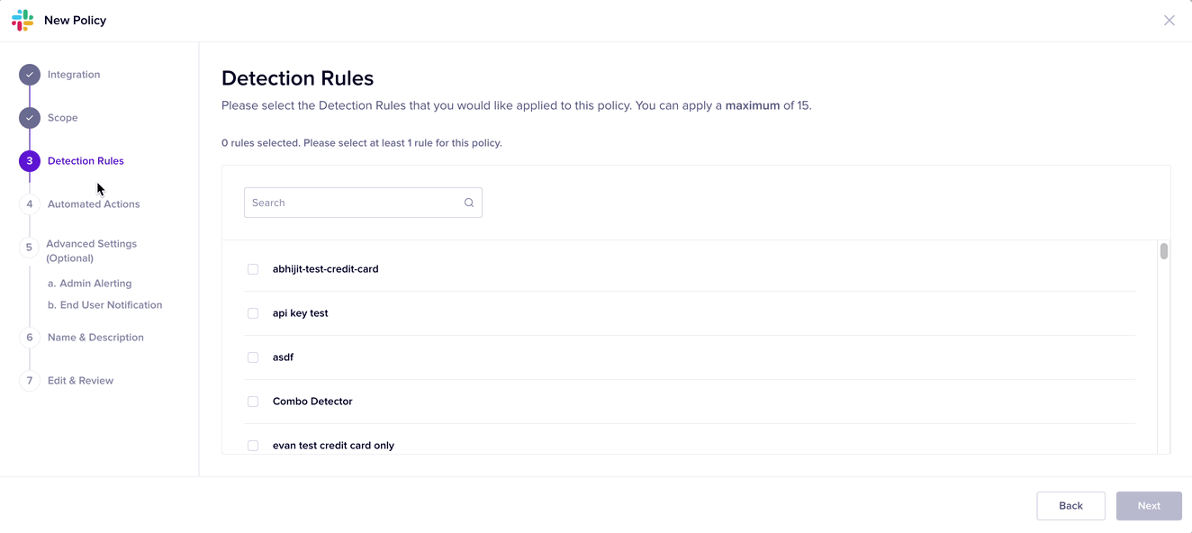In this section, you can select the Detection rules for the policy and If not already created, you can create detection rules. To learn more about how to configure detection rules, see [Configuring Detection Rules](https://help.nightfall.ai/nightfall-ai/nightfall-for-slack/installation-instructions-nightfall-for-slack-1/configuring-detection-rules).